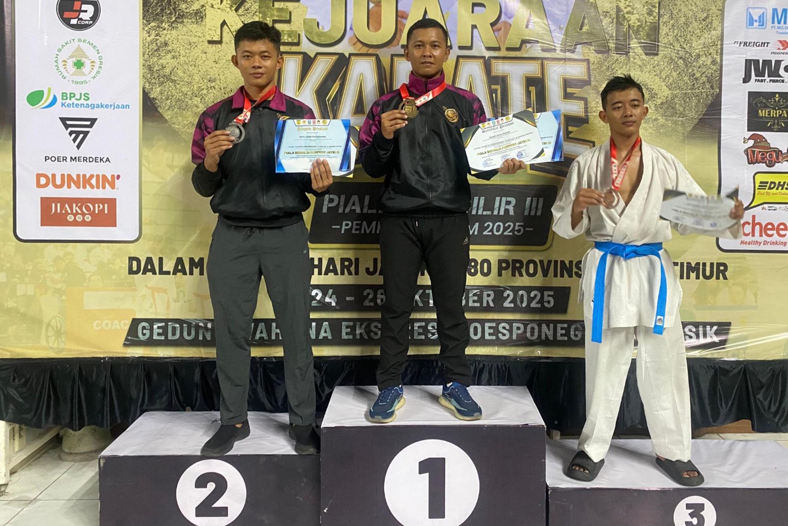 TNI AL, Dispen Kormar (Gresik). Atlet Karateka Batalyon Infanteri 3 Marinir Praka Marinir Bagas Arya Gustaf dan Praka Marinir Tomy Dharmawan berhasil menjadi yang terbaik pada kejuaraan Karate Piala Pemprov Jatim Tahun 2025 di Gedung Olahraga Poesponegoro Gresik, Jawa Timur. Minggu (26/10/2025).