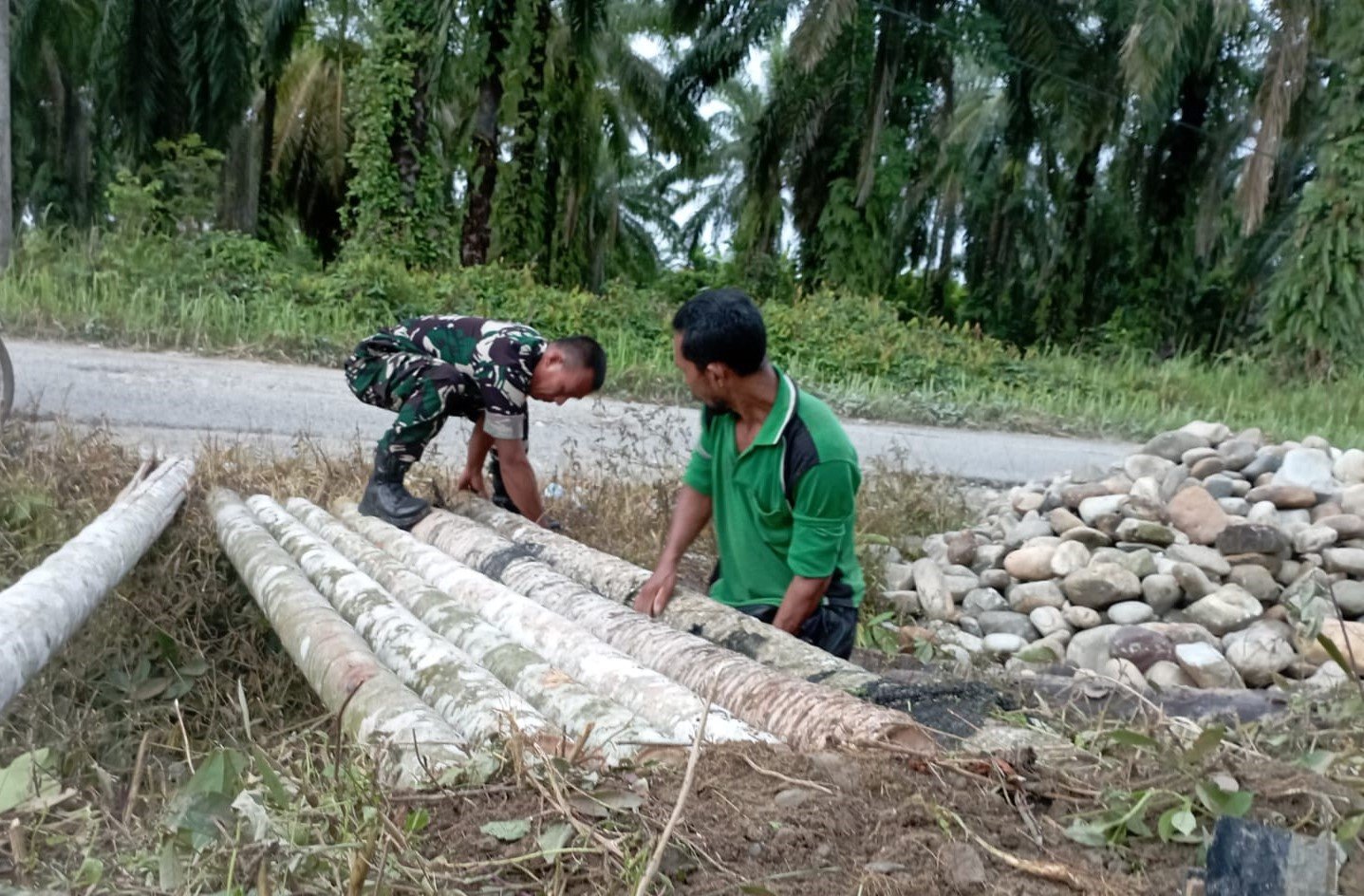 Babinsa dan Warga Simpang Gading Babahrot Gotong Royong Bangun Jembatan Darurat Pertanian