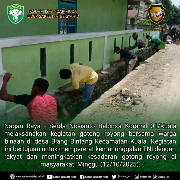 Nagan Raya – Serda Novianto Babinsa Koramil 01/Kuala melaksanakan kegiatan gotong royong bersama warga binaan di desa Blang Bintang Kecamatan Kuala. Kegiatan ini bertujuan untuk mempererat kemanunggalan TNI dengan rakyat dan meningkatkan kesadaran gotong royong di masyarakat. Minggu (12/10/2025).