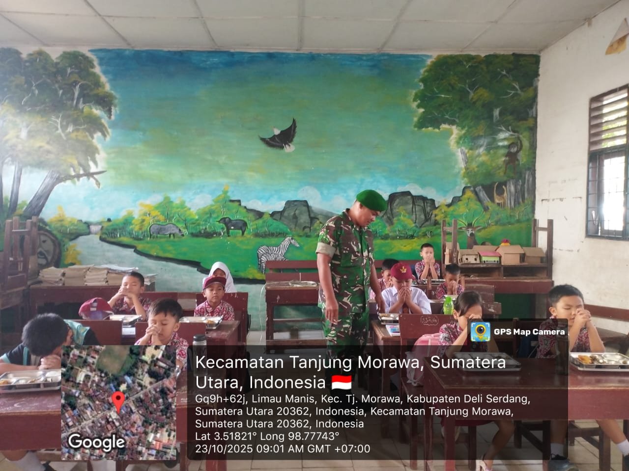 Tanjung Morawa, 23 Oktober 2025 – Dalam upaya mendukung peningkatan gizi dan kesehatan anak-anak sekolah, Babinsa Koramil 0201-16/TM Sertu Dismas Barus melaksanakan kegiatan pendampingan pendistribusian dukungan Makan Sehat Bergizi (MSB) yang disalurkan oleh Badan Gizi Nasional (BGN) melalui SPPG Yayasan Nurul Qomar di Desa Medan Senembah, Kecamatan Tanjung Morawa, Kabupaten Deli Serdang.