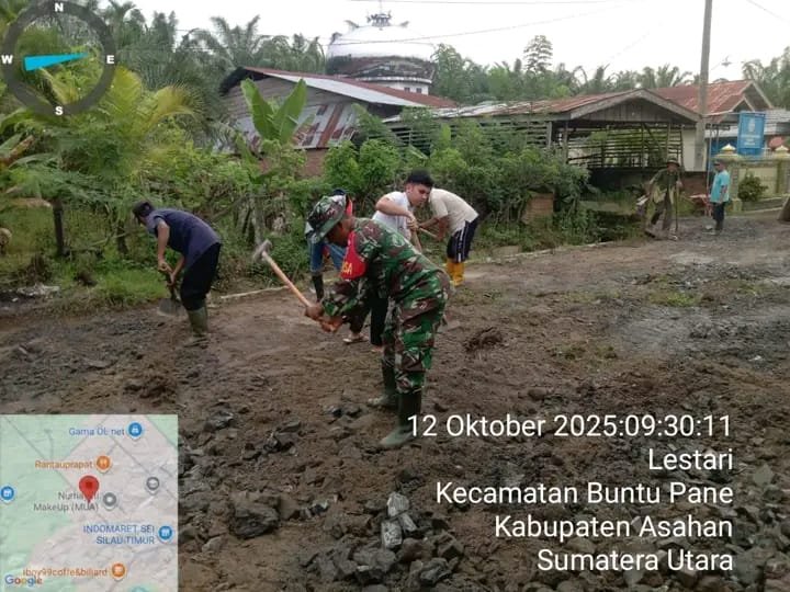 Buntu Pane – Tidak mengenal hari libur, Sertu M. Sagala Babinsa Koramil 13/Buntu Pane Kodim 0208/Asahan bersama masyarakat Dusun VI Aek Nauli, Desa Lestari, Kecamatan Buntu Pane melaksanakan kegiatan gotong royong memperbaiki jalan yang rusak, Minggu (12/10/2025).