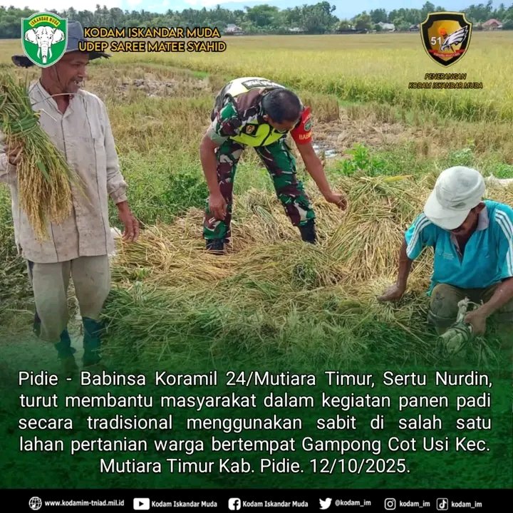 Pidie – Babinsa Koramil 24/Mutiara Timur, Sertu Nurdin, turut membantu masyarakat dalam kegiatan panen padi secara tradisional menggunakan sabit di salah satu lahan pertanian warga bertempat Gampong Cot Usi Kec. Mutiara Timur Kab. Pidie. 12/10/2025.