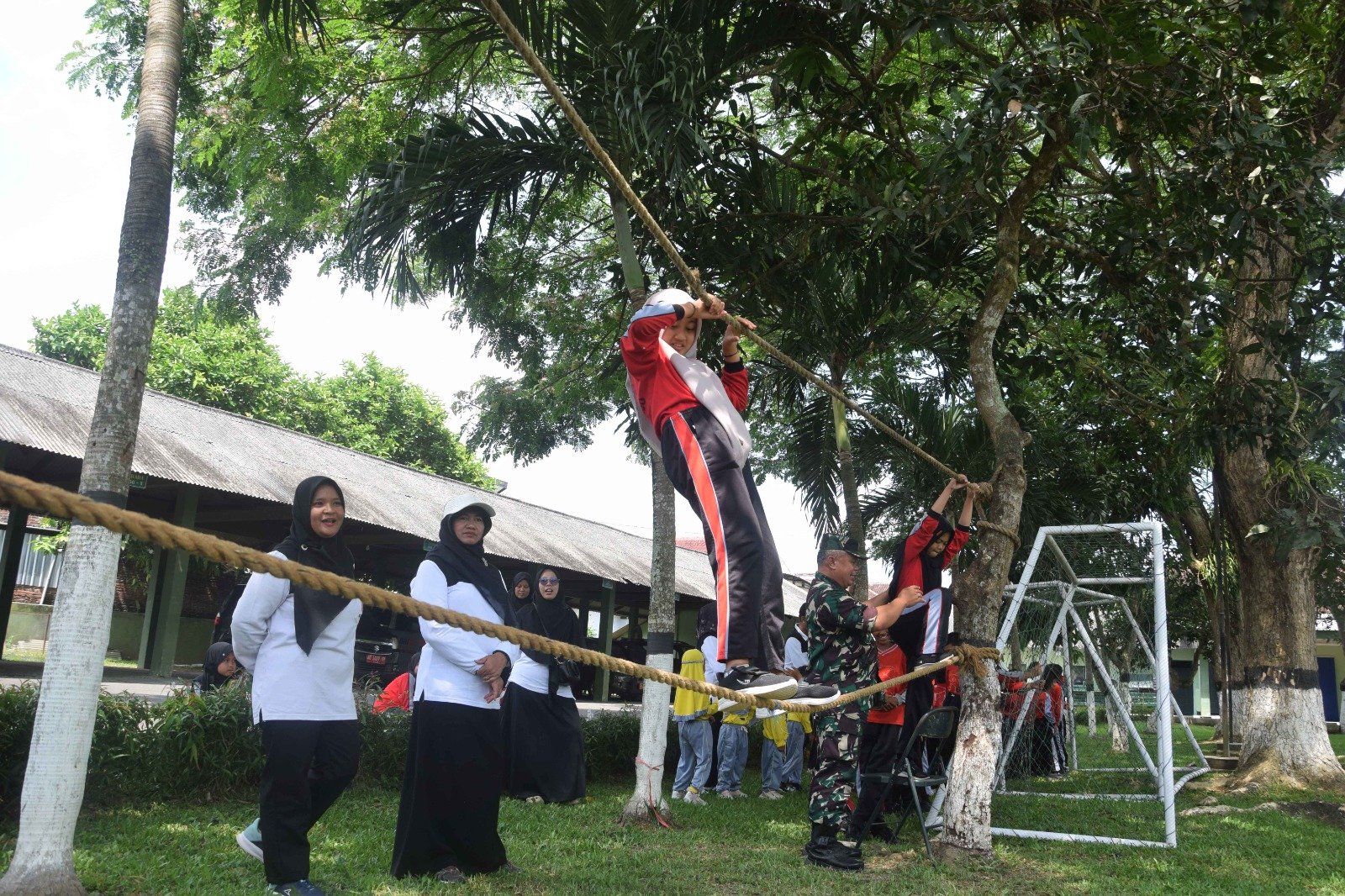 Menambah pengalaman, kegiatan outbound berupa jembatan tali satu turut dihadirkan oleh Pelda Komarul Huda. Wahana ini menjadi ujian keberanian bagi siswa. Meski beberapa awalnya ragu, mereka akhirnya mencoba dengan semangat setelah mendapat motivasi dari prajurit dan teman-temannya. Aktivitas ini mengajarkan pentingnya percaya diri dan keberanian menghadapi tantangan.