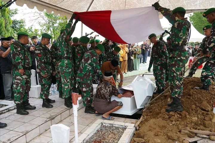 Suasana haru menyelimuti upacara saat iringan doa dan tembakan salvo terakhir mengiringi kepergian lettu Inf (Anumerta) Fauzy Ahmad Sulkarnaen menuju peristirahatan terakhirnya di tanah kelahiran, Kabupaten Pangkep.