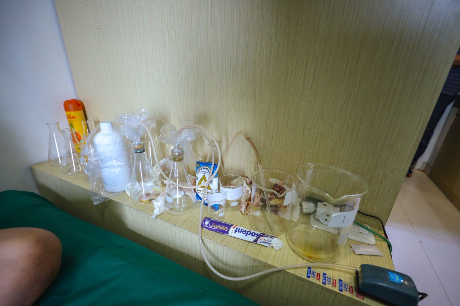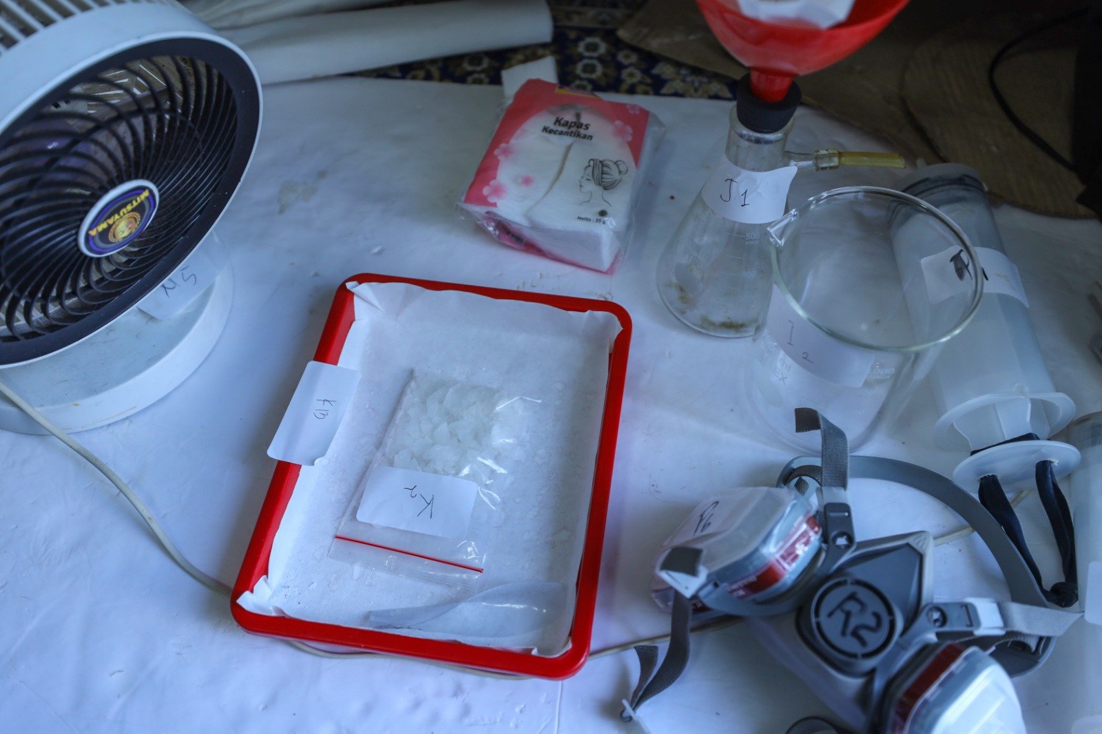 Dari pengungkapan kasus clandestine laboratory di sebuah apartemen ini, Tim Gabungan menemukan berbagai barang bukti, yaitu narkotika jenis sabu padatan hasil produksi sebanyak 209,02 gram dan dalam bentuk cairan sebanyak 319 mililiter. Selain itu, barang bukti lainnya berupa: prekursor ephedrine sekitar 1,06 Kg, prekursor aceton sebanyak 1.503 mililiter, asam sulfat sebanyak 400 mililiter, dan prekursor toluen sebanyak 3,43 liter, 2 gelas kimia (beaker glass), dan peralatan lainnya.