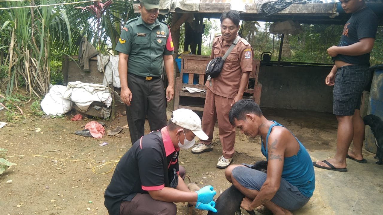 Namorambe – Babinsa Koramil 0201-14/PB, Sertu Abadi Ginting mendampingi tenaga kesehatan hewan dari Dinas Peternakan Kabupaten Deli Serdang yang melaksanakan Vaksin Anti Rabies terhadap hewan peliharaan milik masyarakat di dusun IV Desa Namo Rambe Kecamatan Namorambe, Kabupaten Deli Serdang, Selasa (18/11/2025).