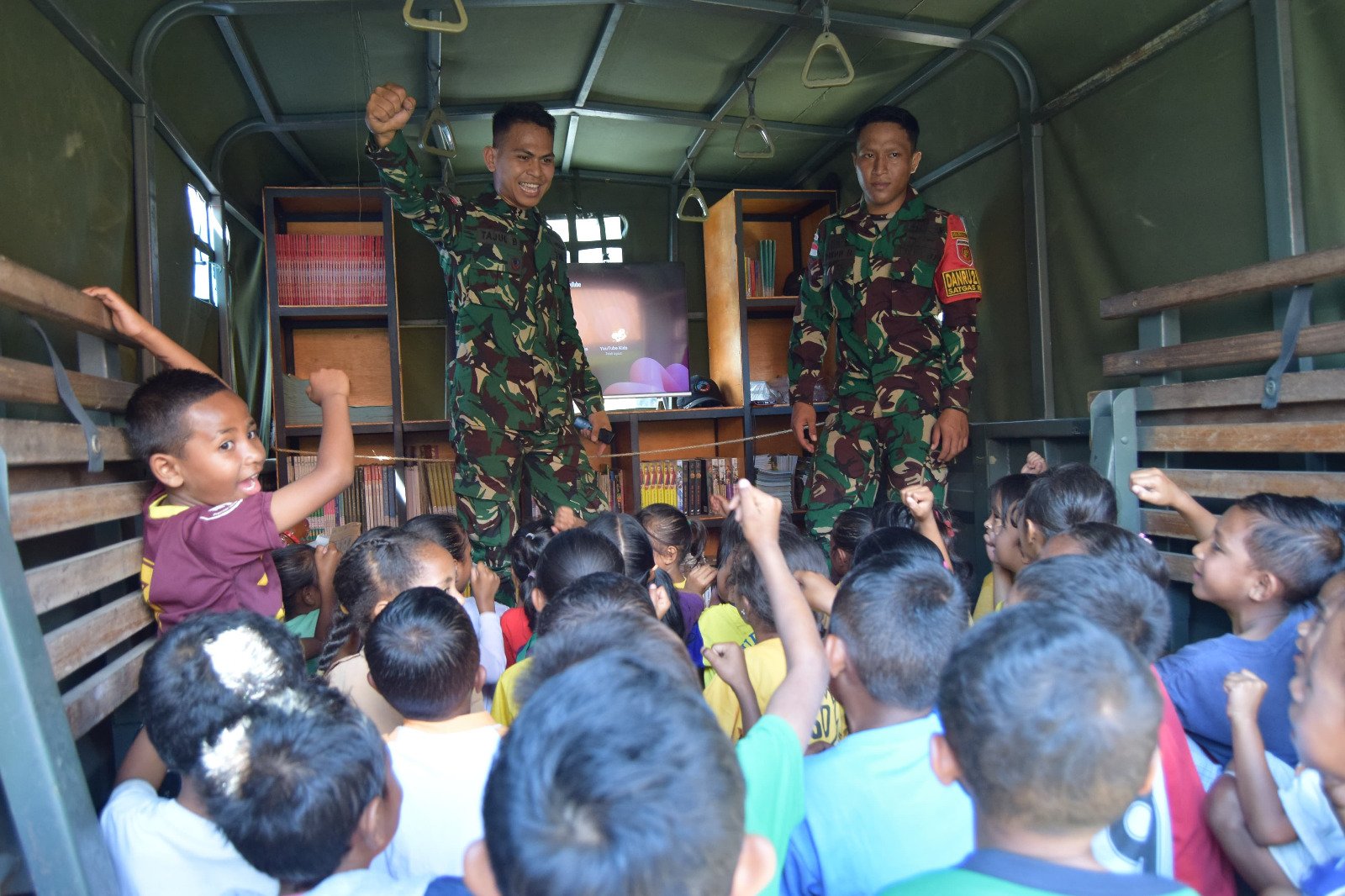 Program ini menghadirkan kendaraan yang dimodifikasi menjadi perpustakaan keliling dan wahana edukasi, membawa berbagai koleksi buku serta sarana belajar interaktif langsung ke tengah-tengah siswa di daerah perbatasan. Kehadiran prajurit Satgas disambut dengan antusiasme tinggi oleh para murid yang tampak bersemangat mengikuti kegiatan belajar dan membaca bersama.