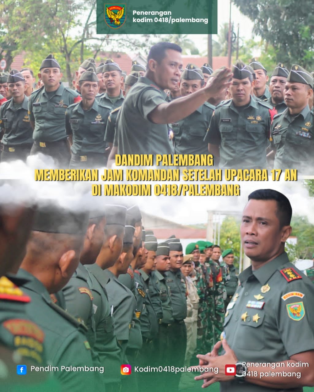 Palembang – Komandan Kodim 0418/Palembang Letkol Arh Erik Novianto,S.sos memberikan Jam Komandan kepada seluruh prajurit dan PNS Kodim 0418/Palembang usai pelaksanaan Upacara Bendera tanggal 17 di Makodim 0418/Palembang. Kegiatan ini merupakan agenda rutin yang digelar untuk meningkatkan disiplin, soliditas, serta pemahaman personel terhadap tugas pokok satuan.