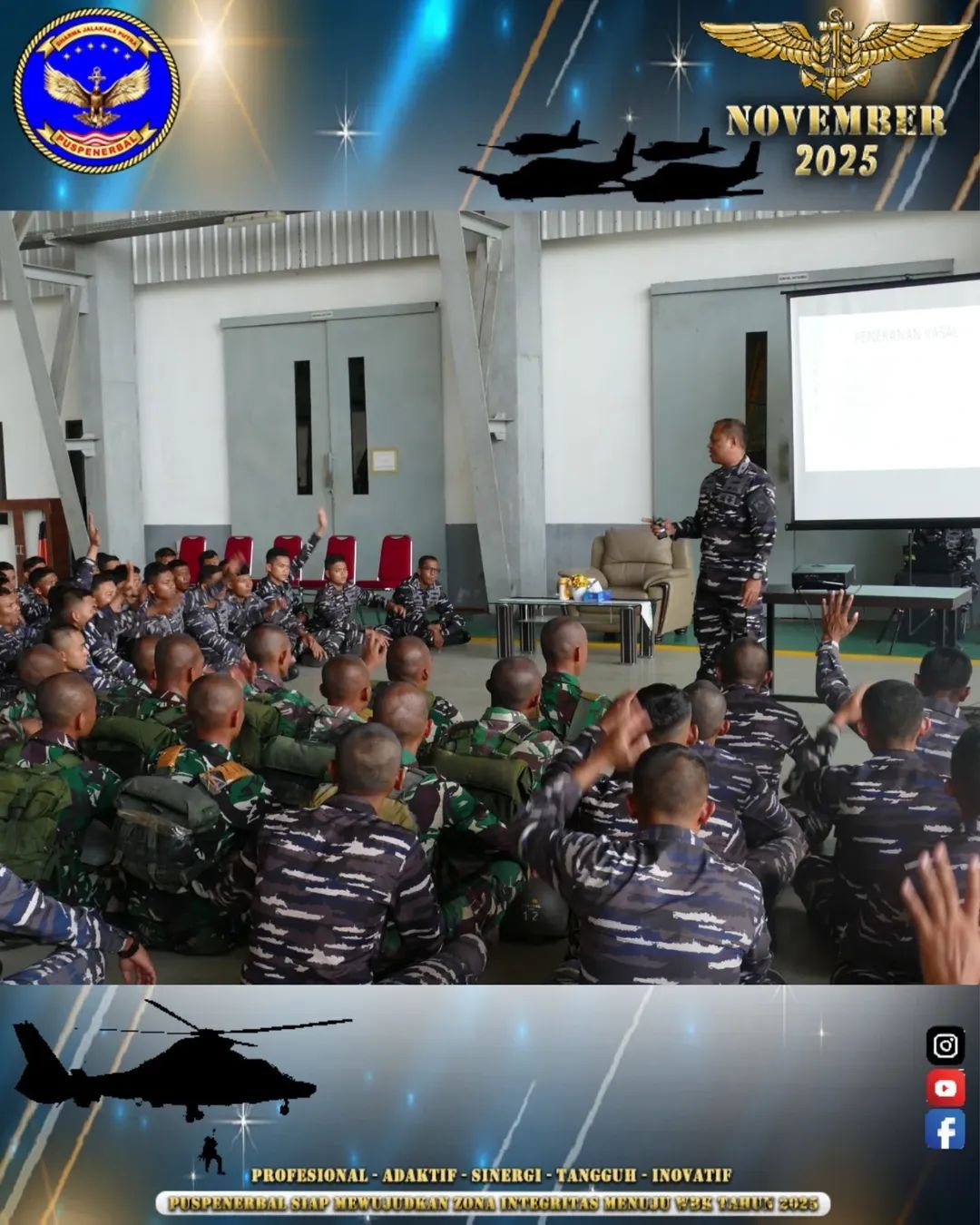 Komandan Pangkalan Udara TNI Angkatan Laut (Danlanudal) Tanjungpinang Letkol Laut (P) Tatang Yanuar Ristanto memberikan pengarahan khusus kepada seluruh Perwira, Bintara, dan Tamtama Tidur Dalam Penerbangan TNI AL wilayah Tanjungpinang di Hanggar Lanudal Tanjungpinang, Sabtu (8/11/2025).