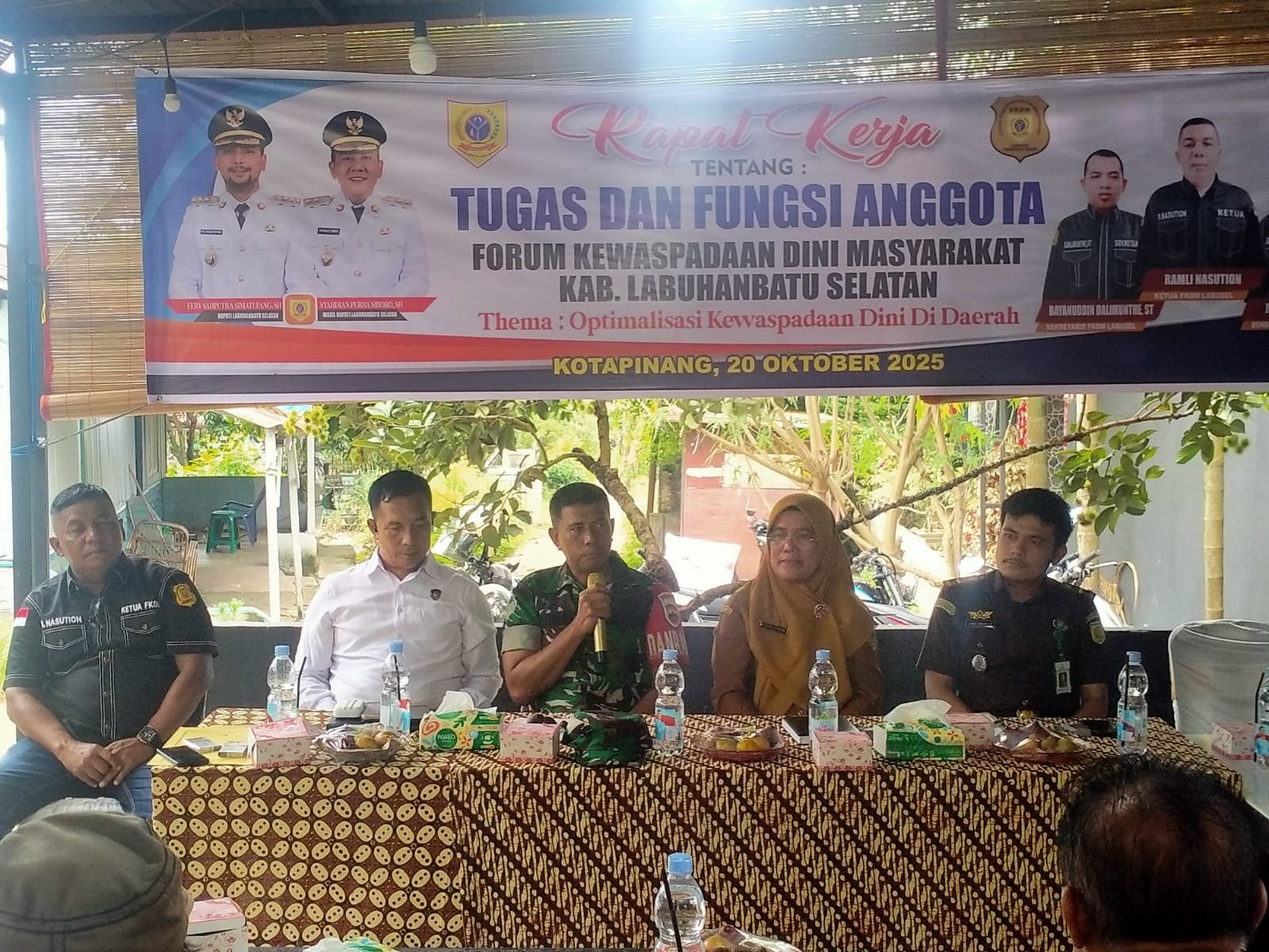 Labuhanbatu Selatan – Danramil 11/KP Mayor Inf Hendra Gunawan mewakili Dandim 0209/ LB hadiri acara Rapat Kerja tentang tugas dan fungsi anggota Forum Kewaspadaan Dini Masyarakat (FKDM) dengan tema Optimalisasi Kewaspadaan Dini di Daerah yang dilaksanakan di Kantin Mak Elan Jalan Bukit Kelurahan Kotapinang Kecamatan Kotapinang Kabupaten Labuhanbatu Selatan pada 20/10/2025.