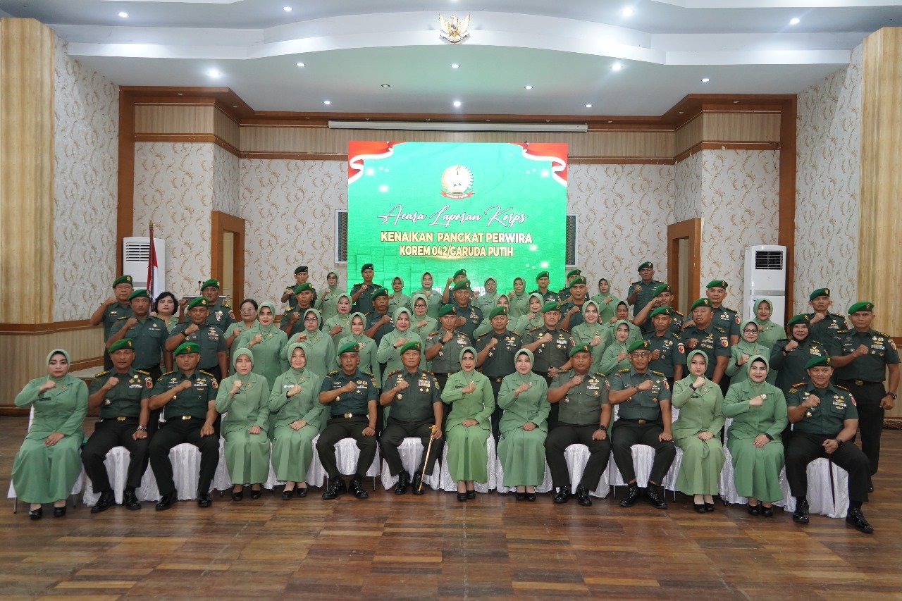 Danrem 042/Gapu Brigjen TNI Heri Purwanto, S.E., M.Sc., dalam amanatnya menyampaikan ucapan selamat kepada perwira yang naik pangkat dan keluarga.