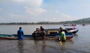 Rangkaian acara penyambutan mencakup penghormatan kapal, tari-tarian adat, dan pengalungan bunga kepada Komandan KRI Balongan-908, Letkol Laut (P) Priyanto Widodo.