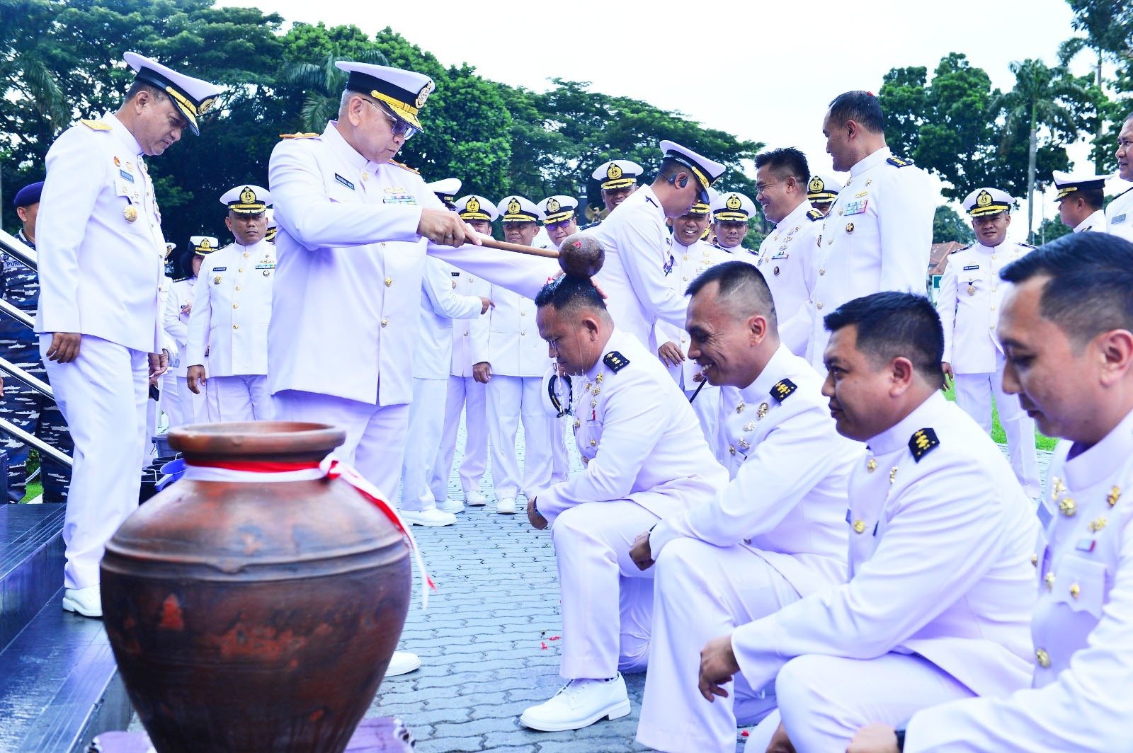 Komandan Sekolah Staf dan Komando Angkatan Laut (Danseskoal) Laksamana Muda TNI Ariantyo Condrowibowo memimpin langsung acara tradisi penyiraman air bunga dalam prosesi kenaikan pangkat prajurit dan Pegawai Negeri Sipil (PNS) di lingkungan Seskoal, bertempat di lapangan Laut Jawa Seskoal, Cipulir, Jakarta Selatan, Rabu (1/10/2025).