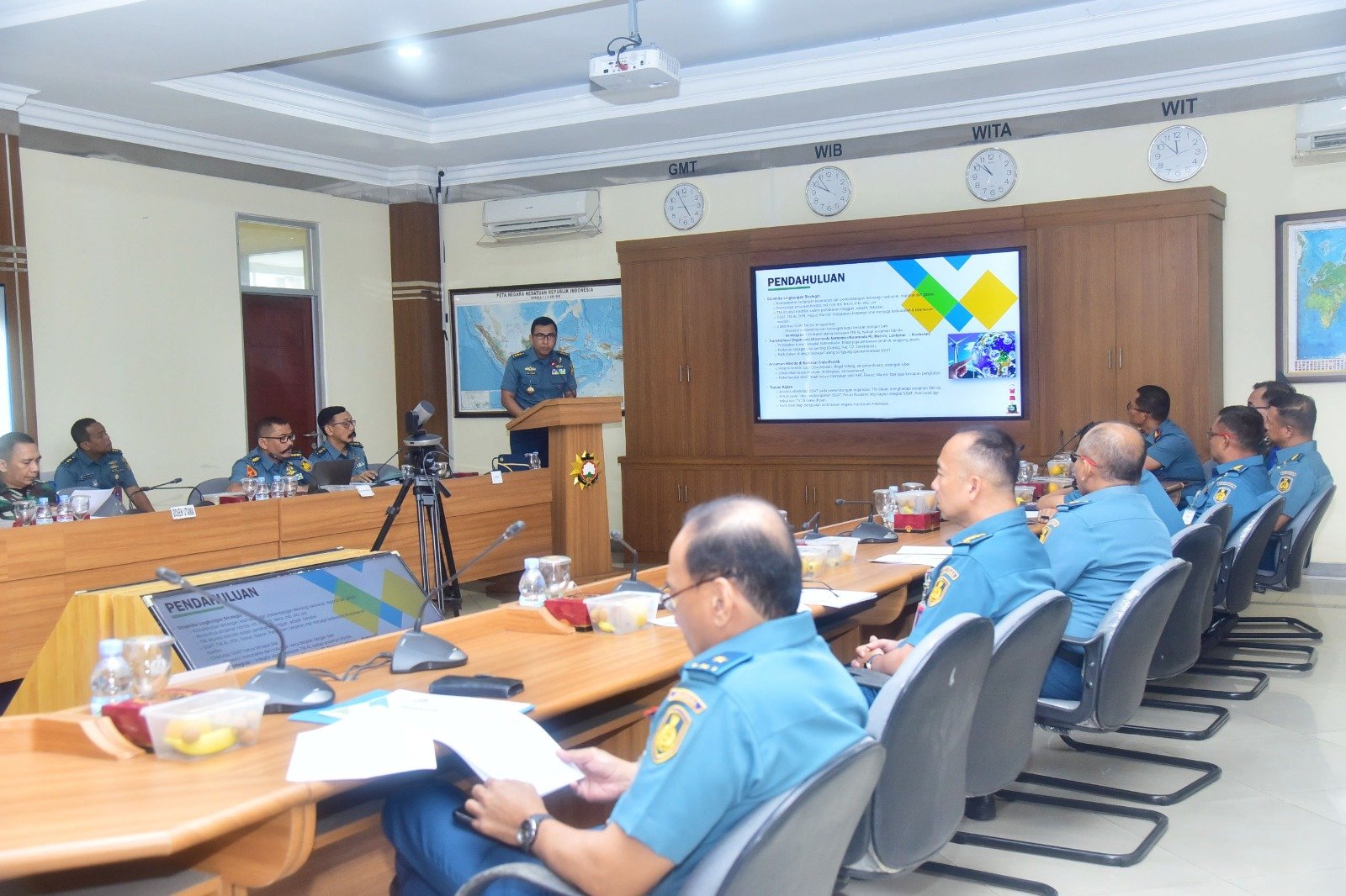 Komandan Sekolah Staf dan Komando Angkatan Laut (Danseskoal) Laksamana Muda TNI Ariantyo Condrowibowo menerima paparan Wakil Kepala Pusat Pengkajian Maritim (Waka Pusjianmar) Seskoal Kolonel Laut (P) Heru Syamsul Hidayat dan Kabag Itormet Setlem Seskoal Letkol Laut (S) Agung Setiawan, bertempat di ruang rapat utama gedung Samadikun, Seskoal, Cipulir, Kebayoran Lama, Jakarta Selatan, Kamis (30/10/2025).