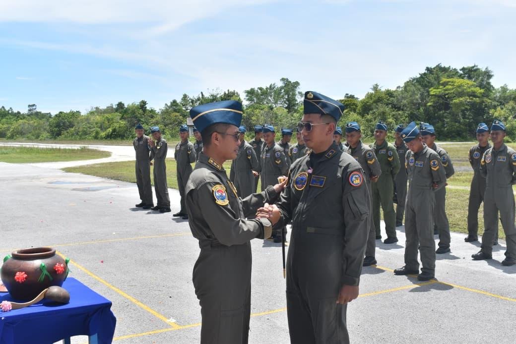 Komandan Wing Udara 3 Puspenerbal, Kolonel Laut (P) Ahmad Novam Hajaruman mengukuhkan Kapten Laut (P) Ahmad Fahmi Ali Akbar sebagai Captain Pilot_Panther AS 565 Mbe dalam Tradisi Fly Navy yang digelar di Ex Taxiway Sorido belakang Mako Wing Udara 3 Puspenerbal Biak, Papua, Selasa (18/11/2025).