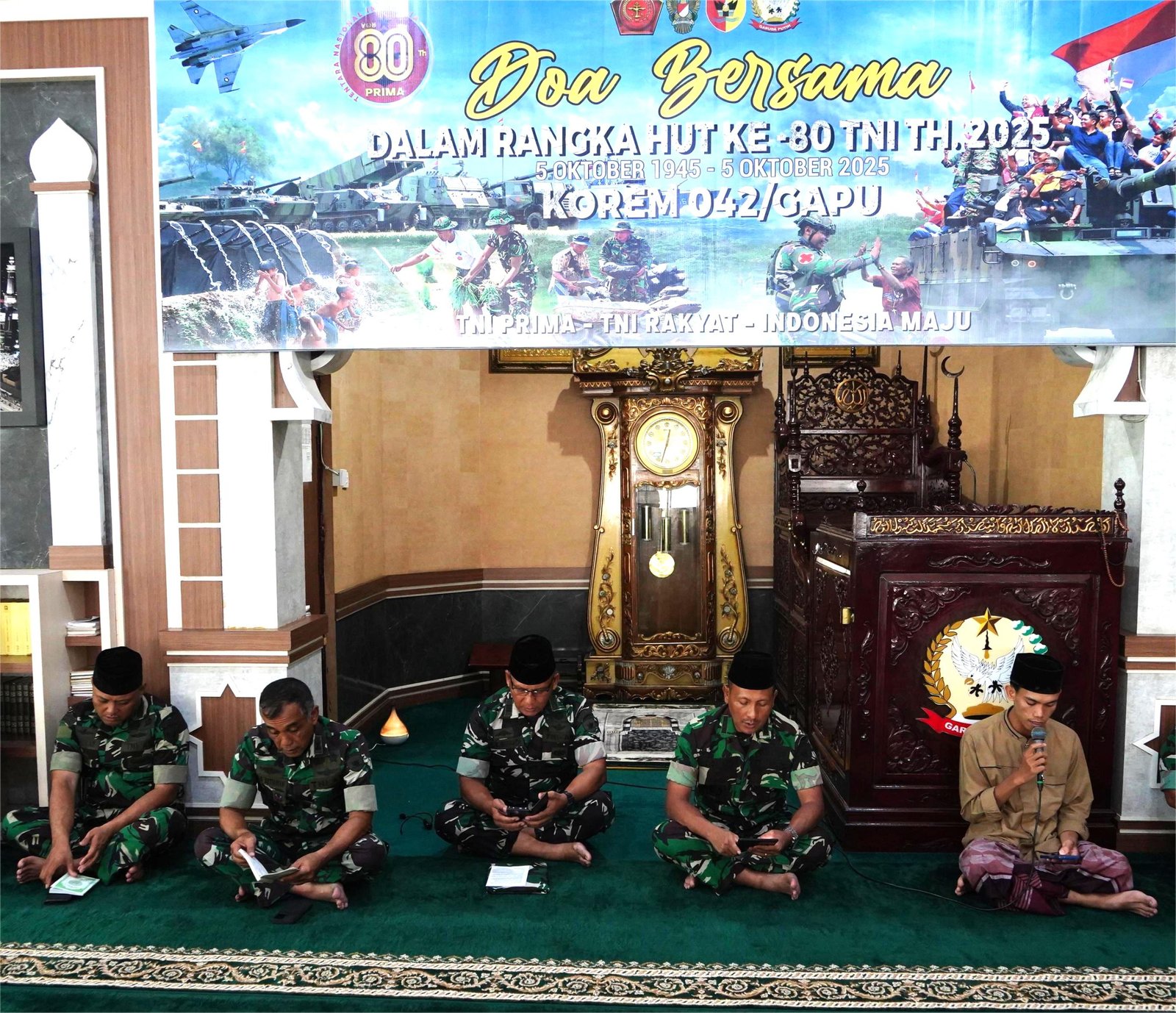Jambi – Dalam rangka memperingati Hari Ulang Tahun (HUT) ke – 80 Tentara Nasional Indonesia (TNI) tahun 2025 yang mengusung tema “TNI Prima, TNI Rakyat, Indonesia Maju”, Korem 042/Garuda Putih menggelar Do’a bersama di Masjid At – Taqwa Korem 042/Gapu, Jumat (4/10/2025).