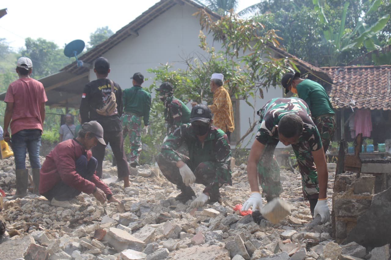 Dispen Kormar (Sukabumi). Suasana haru menyelimuti Kampung Cisaray, RT/RW 04/01, Desa Sindang Resmi, Kecamatan Jampang Tengah, Kabupaten Sukabumi, pada Selasa (21/10/2025). Prajurit Pusat Latihan Pertempuran (Puslatpur) Marinir 6 Antralina bersama warga masyarakat bahu-membahu melaksanakan bakti sosial, membersihkan puing-puing rumah Ibu Nunung yang luluh lantak akibat korsleting listrik. Musibah ini meninggalkan luka mendalam bagi Ibu Nunung, namun kehadiran prajurit dan warga menjadi secercah harapan di tengah kepedihan.