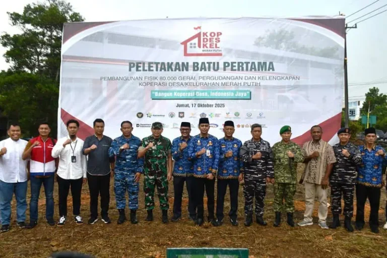 TANJUNGPINANG – Kepala staf Korem (Kasrem) 033/WP Kolonel Inf Achmad Marzuki menghadiri peletakan batu pertama pembangunan fisik Koperasi Merah Putih 80.000 gerai, pengudangan dan kelengkapan Koperasi Desa/Kelurahan Merah Putih di Jalan Wonosari Kelurahan Kota Baru Kecamatan Teluk Sebong Kabupaten Bintan, Jumat (17/10/2025).