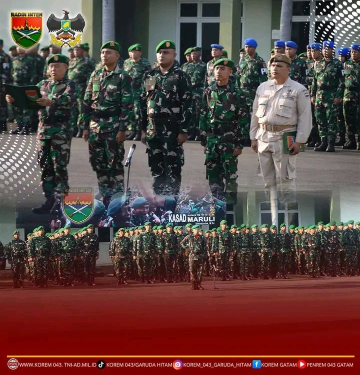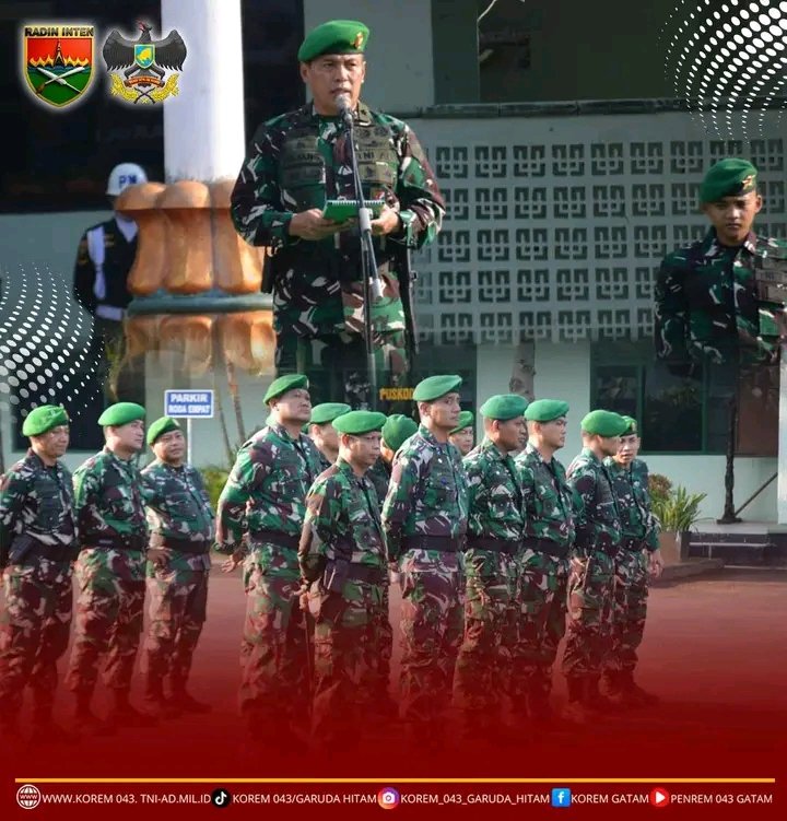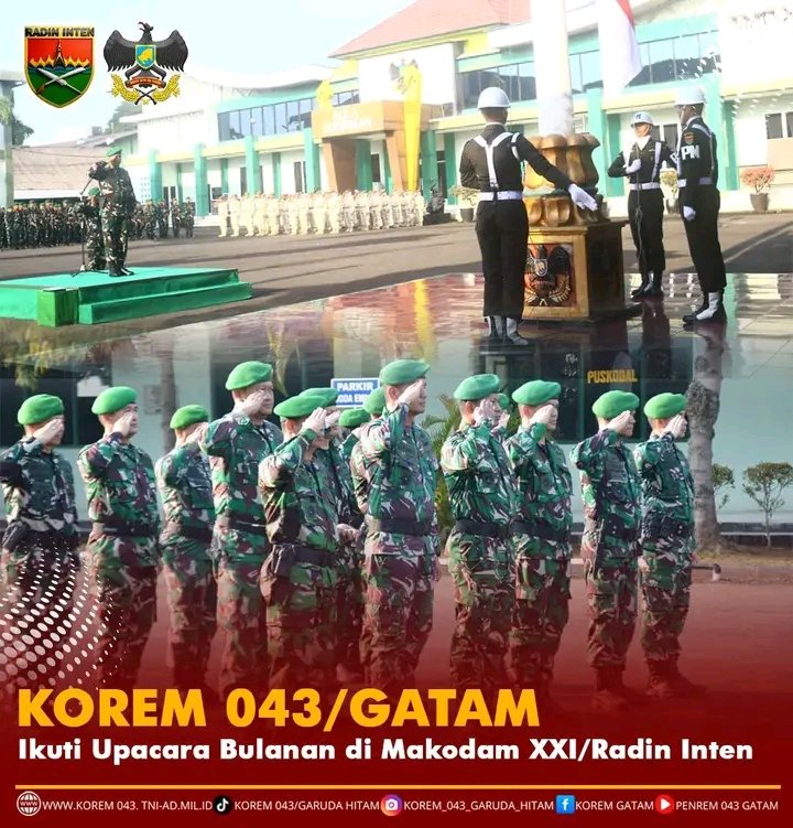 Lampung – Kepala Staf Korem 043/Garuda Hitam Kolonel Inf Sumarlin Marzuki, S.E., M.Han., mengikuti upacara bendera bulanan yang dipimpin oleh Inspektur Kodam (Irdam) XXI/Radin Inten Brigjen TNI Enjang, S.I.P., M.Han., bertempat di Lapangan Upacara Makodam XXI/Radin Inten, Jalan Teuku Umar, Penengahan, Bandar Lampung, Jumat (17/10/2025).