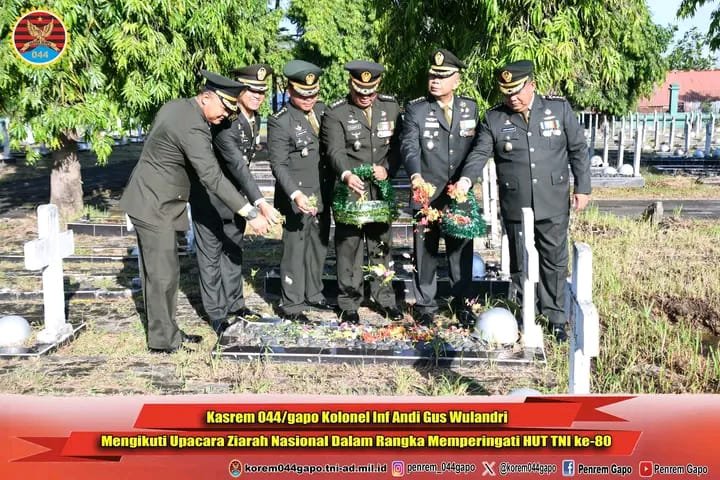 Palembang – Mewakili Danrem 044/Gapo, Kasrem 044/gapo Kolonel Inf Andi Gus Wulandri mengikuti Upacara Ziarah Nasional dalam rangka memperingati HUT TNI ke-80 Tahun 2025, bertempat di Taman Makam Pahlawan (TMP) Ksatria Ksetra Siguntang Palembang, Jumat (3/10/2025).
