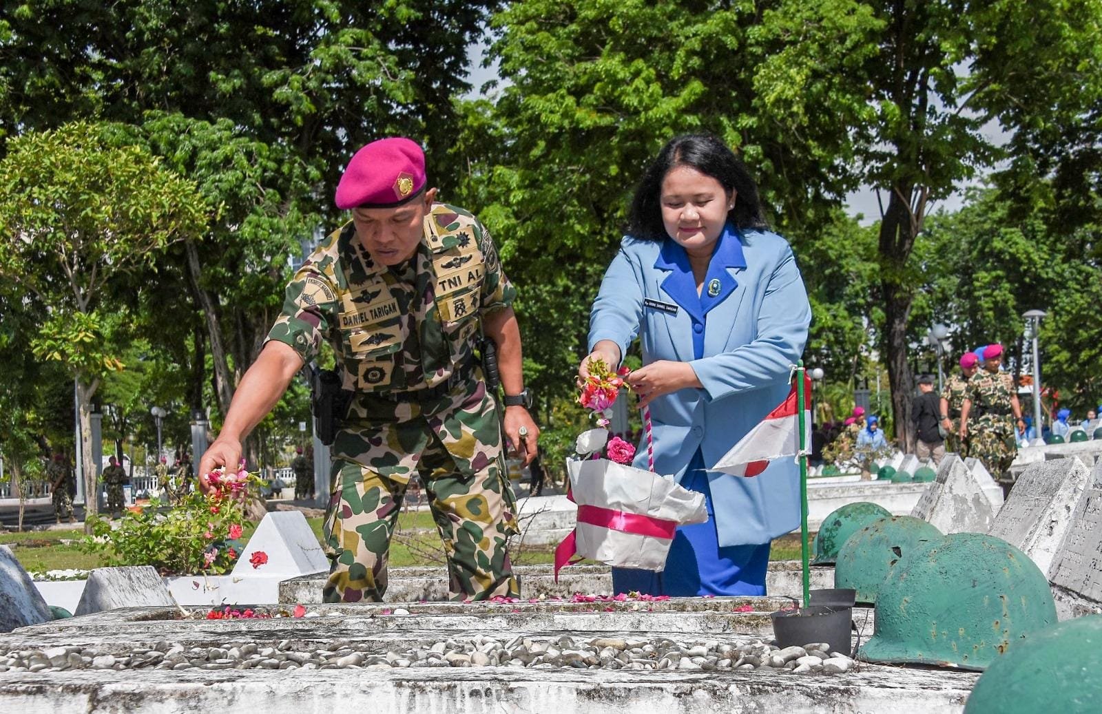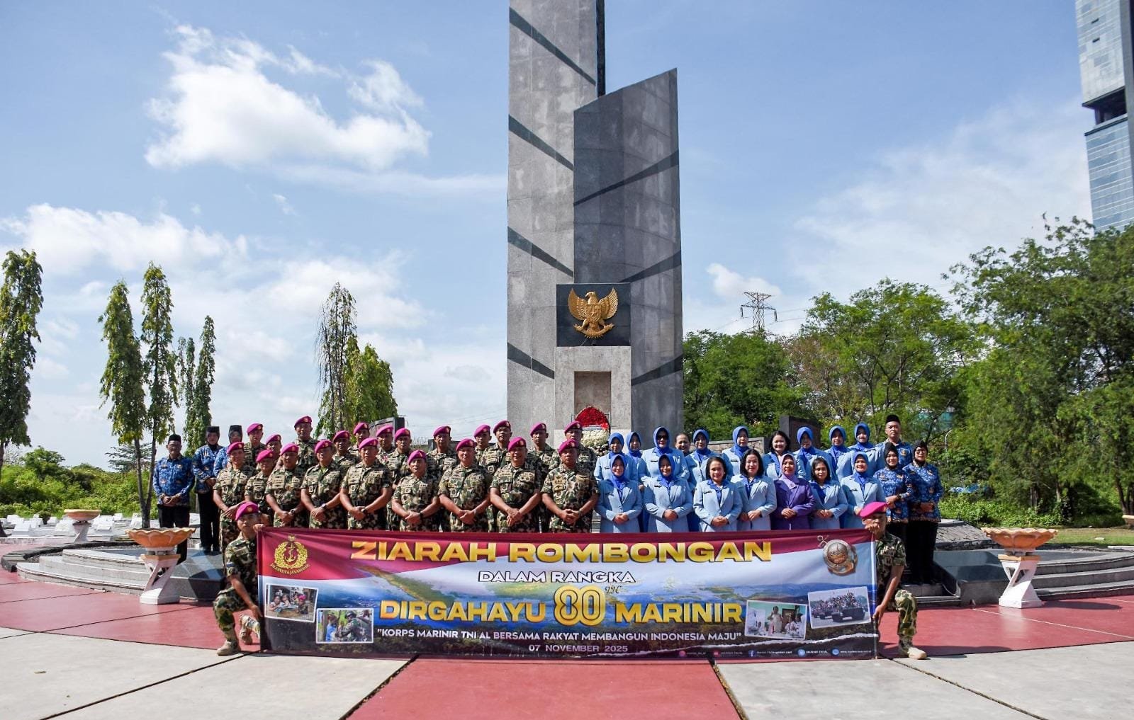TNI AL, Dispen Kormar (Surabaya). Mengenang jasa para Pahlawan, Komandan Brigade Infanteri 2 Marinir Kolonel Marinir Daniel Tarigan Bersama Ketua Jalasenastri Brigif 2 Marinir Ny. Debie Daniel Tarigan mengikuti ziarah dan tabur bunga di Taman Makam Pahlawan (TMP) Sepuluh November Jl. Mayjen Sungkono Kec. Dukuh Pakis Kota Surabaya, Jawa Timur. (07/11/2025).