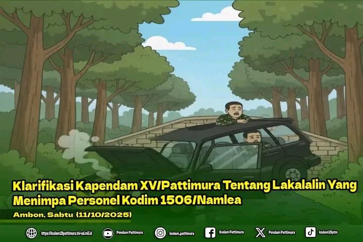 Ambon, 11 Oktober 2025 – Kepala Penerangan Kodam (Kapendam) XV/Pattimura Kolonel Inf Heri Krisdianto menyampaikan rasa duka cita yang mendalam atas kecelakaan lalu lintas tunggal yang terjadi pada hari Jumat, 10 Oktober 2025 di Jalan Poros Desa Unit 5/Wanakarta, Kecamatan Lolong Guba, Kabupaten Buru, yang menimpa 5 (lima) personel Kodim 1506/Namlea.
