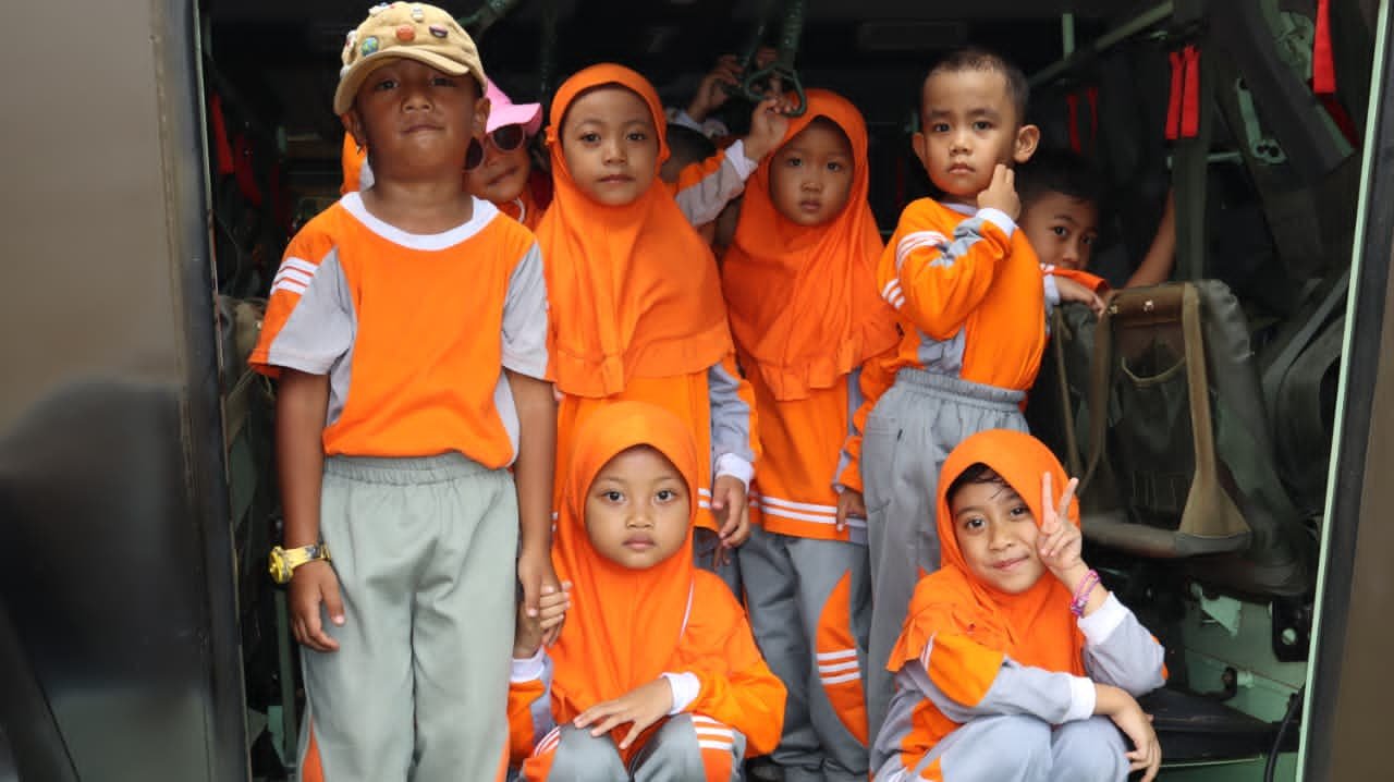 Tak kalah menarik, anak-anak juga berkesempatan melihat dan bahkan menaiki kendaraan militer. Dengan wajah penuh rasa ingin tahu, mereka belajar tentang fungsi kendaraan tempur yang digunakan TNI dalam menjalankan misi kemanusiaan dan pertahanan.