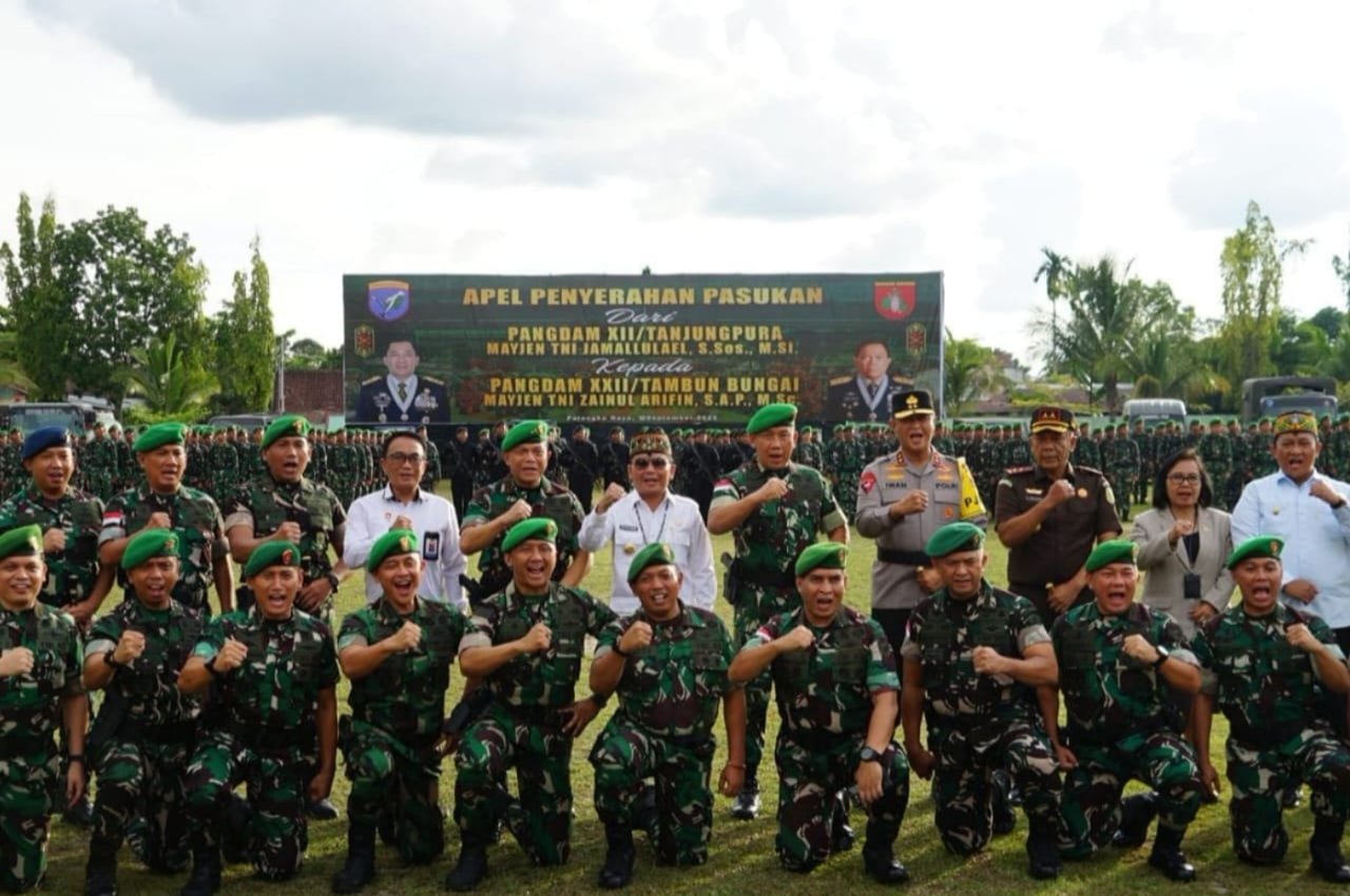 Apel penyerahan pasukan dari Pangdam XII/Tanjungpura, Mayjen TNI Jamallulael kepada Pangdam XXII/Tambun Bungai, Mayjen TNI Zainul Arifin berlangsung khidmat di Lapangan Makodam XXII/Tambun Bungai, Palangka Raya, Rabu (10/9/2025).