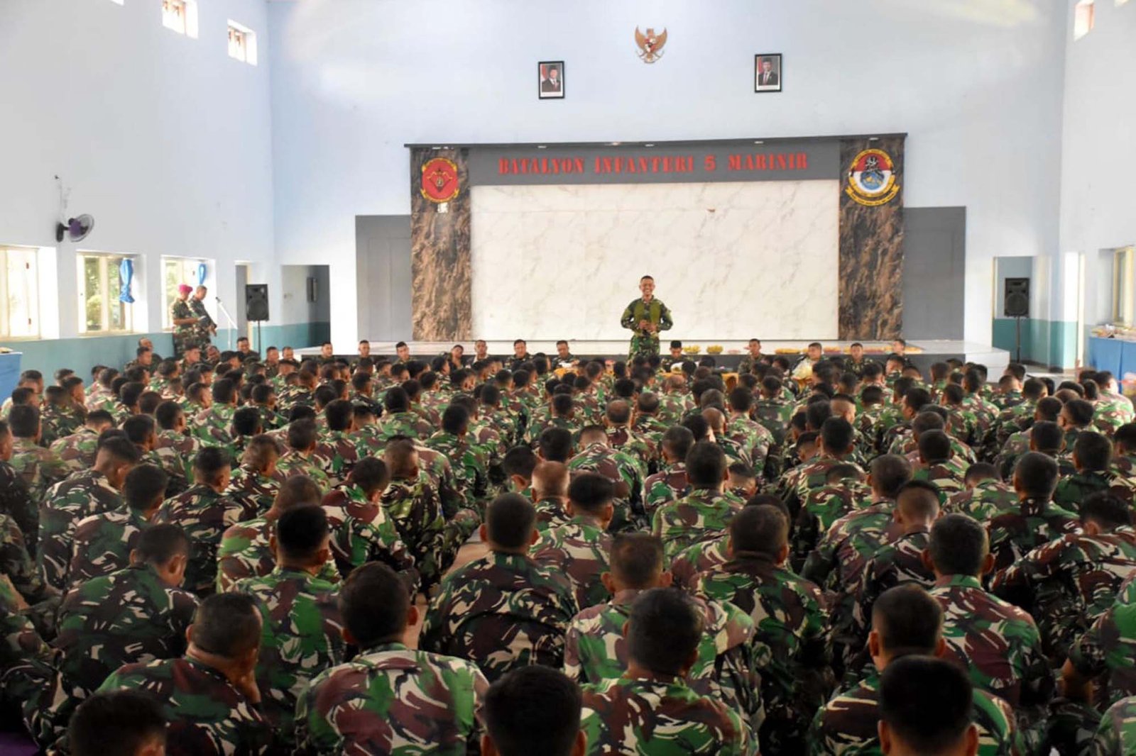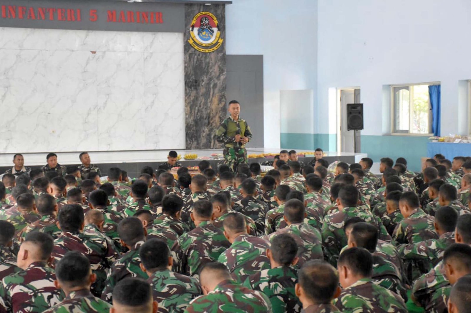 TNI AL, Dispen Kormar (Surabaya). Komandan Batalyon Infanteri 5 Marinir Letkol Marinir Teguh Pristiyanto Dwi S.S., E., M.Tr.Opsla melaksanakan Jam Komandan kepada seluruh prajurit petarung “Gurita Cakti” Yonif 5 Marinir di gedung Balai Prajurit Kesatrian Marinir Soeroto II Ujung, Semampir, Surabaya, Jawa Timur. Kamis (02/10/2025).