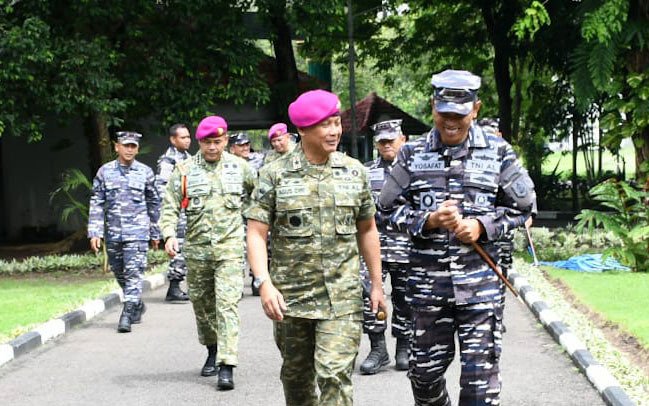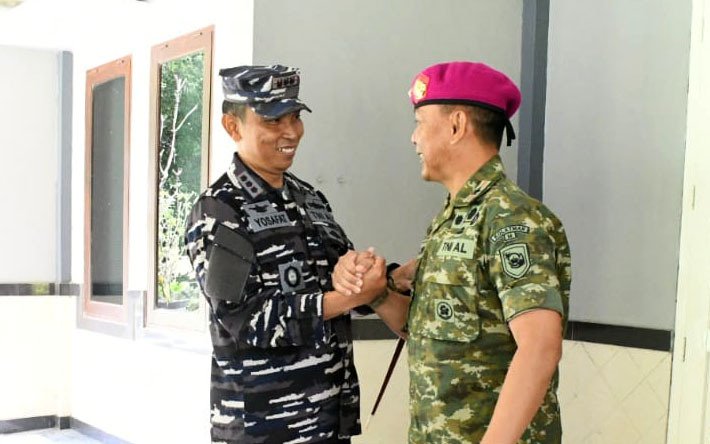 Dispen Kormar (Pasuruan). Komandan Komando Latihan Marinir (Dankolatmar) Brigjen TNI (Mar) Agus Dwi Laksana Putra didampingi Wadan Kolatmar dan Paops Kolatmar laksanakan Courtesy Call kepada Komandan Pusat Latihan Pendidikan Dasar Militer (Danpuslatdiksarmil) Kodiklatal Kolonel Laut (P) Yosafat Indarto, S.T. di Juanda Surabaya, Jumat (14/11/2025).