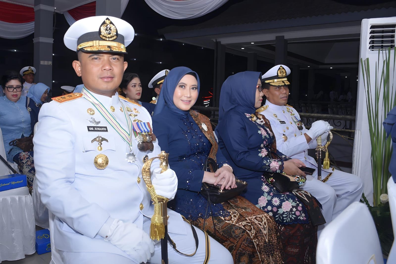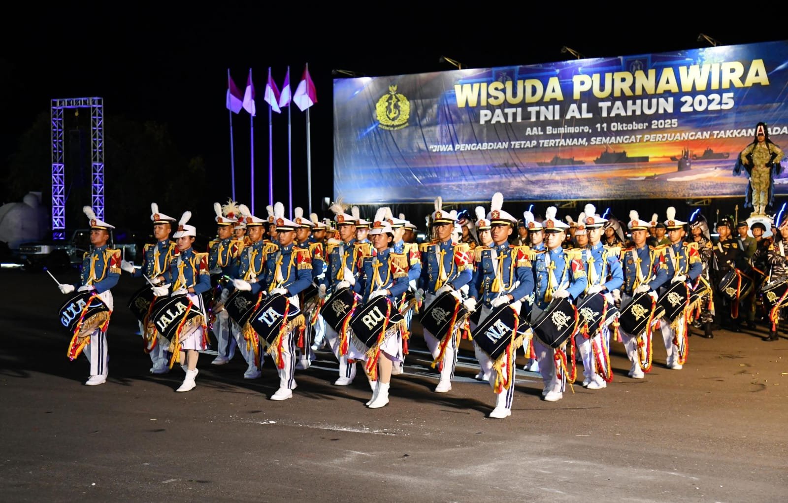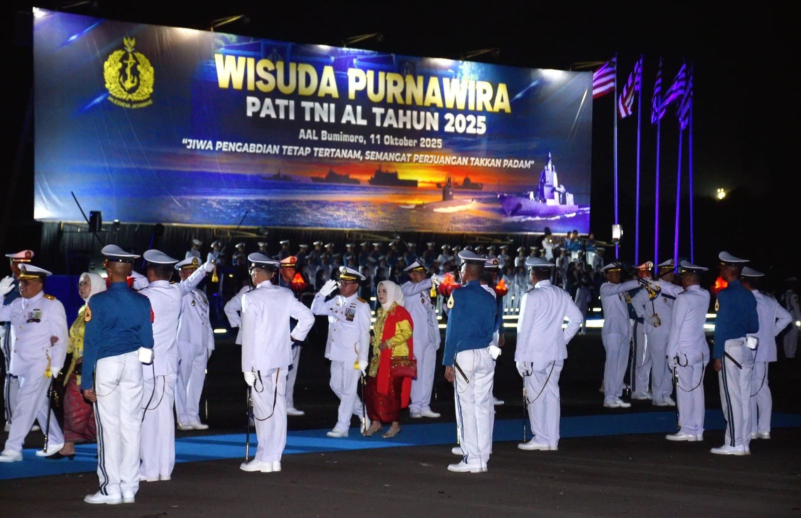 Dispen Kormar, TNI AL (Surabaya). Komandan Pasmar 2 Mayjen TNI (Mar) Dr. Oni Junianto didampingi Ketua Korcab Pasmar 2 Gabungan Jalasenastri Korps Marinir Ny. Dian Oni Junianto, menghadiri upacara Wisuda Purnawira Perwira Tinggi (Pati) TNI AL tahun 2025 di lapangan Arafuru Akademi Angkatan Laut (AAL), Bumimoro, Surabaya. Sabtu (11/10/2025) malam.