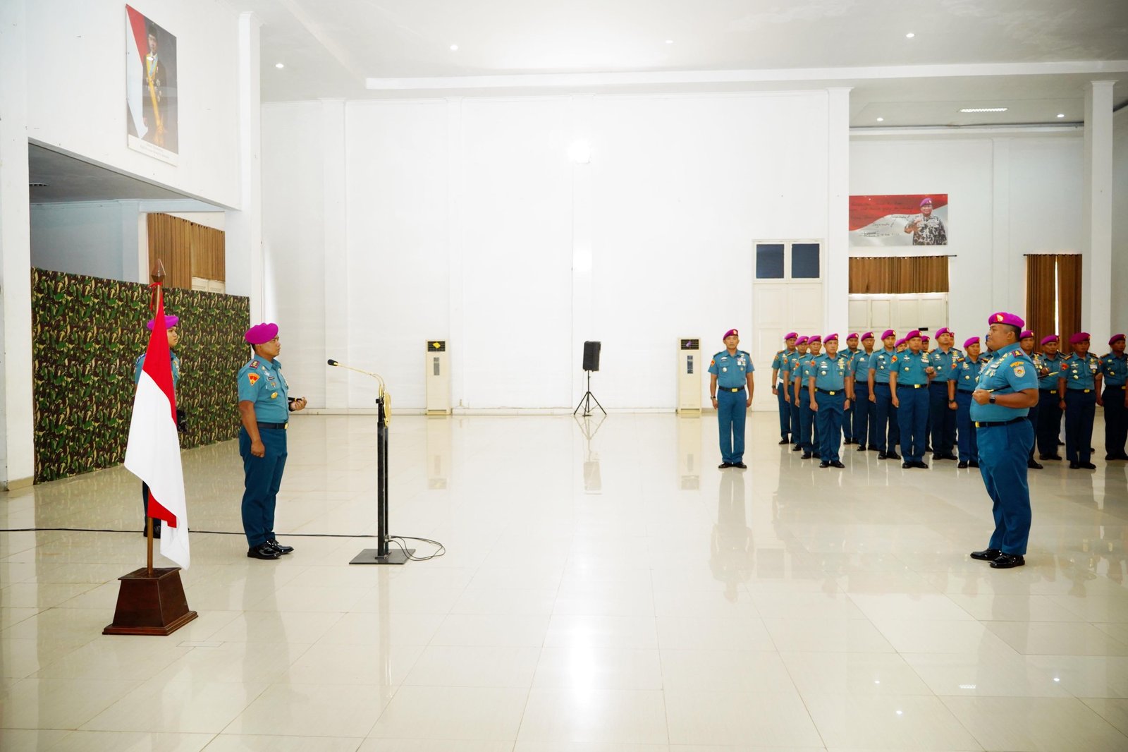 Dispen Kormar TNI AL (Surabaya). Komandan Pasmar 2 Mayjen TNI (Mar) Dr. Oni Junianto menerima laporan kenaikan pangkat Perwira Menengah (Pamen) Pasmar 2 di Graha Gafur Chalik, Kesatrian Marinir Moekijat, Gedangan, Sidoarjo. Rabu (08/10/2025).