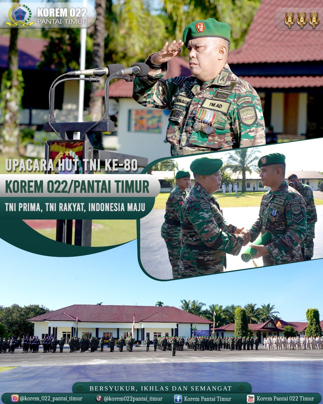 Pematangsiantar – Korem 022/Pantai Timur menggelar upacara peringatan Hari Ulang Tahun Tentara Nasional Indonesia (HUT TNI) Ke-80 tahun 2025 di Lapangan Jenderal Soedirman Makorem 022/PT di jalan Asahan Km 3,5 Kecamatan Siantar Kabupaten Simalungun, Minggu (05/10/2025).Upacara dipimpin Kapenrem 022/PT Letkol Arm Tambok Sinaga dan diikuti oleh puluhan personel.