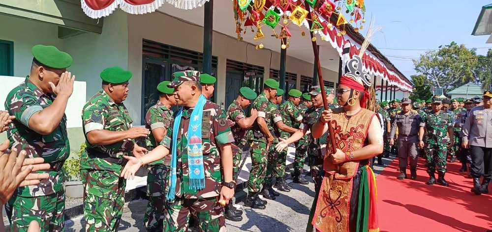 Kunjungan diawali dengan laporan resmi dari Dandim 1014/Pbn, Letkol Inf Makin, S.Sos., M.I.P., di depan gerbang Makodim. Suasana penyambutan berlangsung khidmat dan meriah, dimeriahkan dengan tradisi khas Kalimantan Tengah seperti Potong Pantan, Kotap Besi, serta tarian adat dari Sanggar Bakuba Pangkalan Bun. Selain itu, lorong prajurit dibentuk sebagai bentuk penghormatan kepada Pangdam sebagai tamu kehormatan.