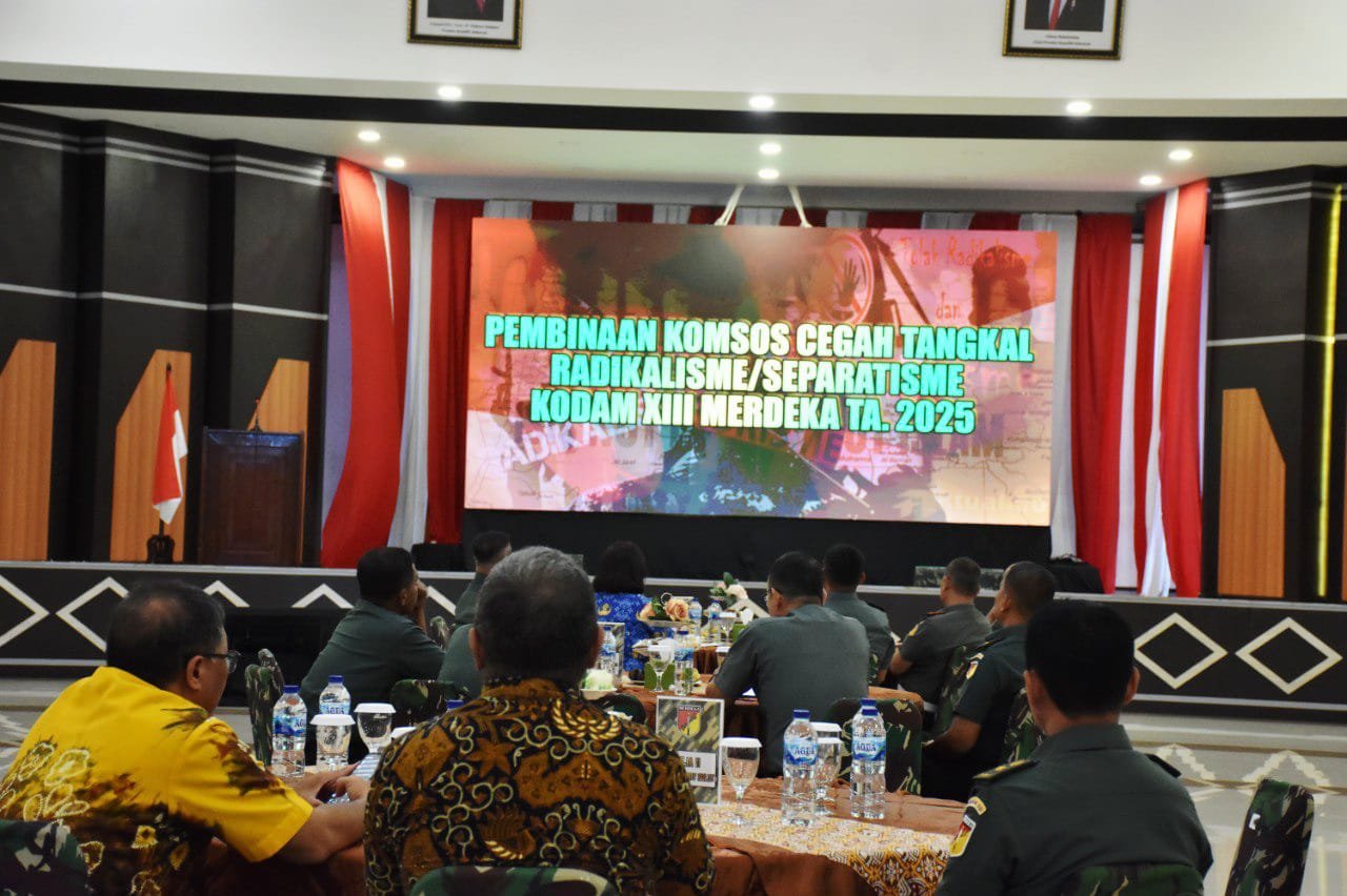 Manado, 17 November 2025 – Kodam XIII/Merdeka kembali melaksanakan kegiatan Pembinaan Komunikasi Sosial (Binkomsos) dalam rangka Cegah Tangkal Radikalisme dan Separatisme TA 2025. Kegiatan ini berlangsung di Ghradika Jaya Sakti Makodam XIII/Merdeka, Senin (17/11/2025), dengan melibatkan Dinas Lingkungan Hidup Sulut, organisasi kepemudaan serta perwakilan mahasiswa se- Sulawesi Utara.