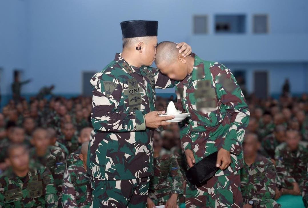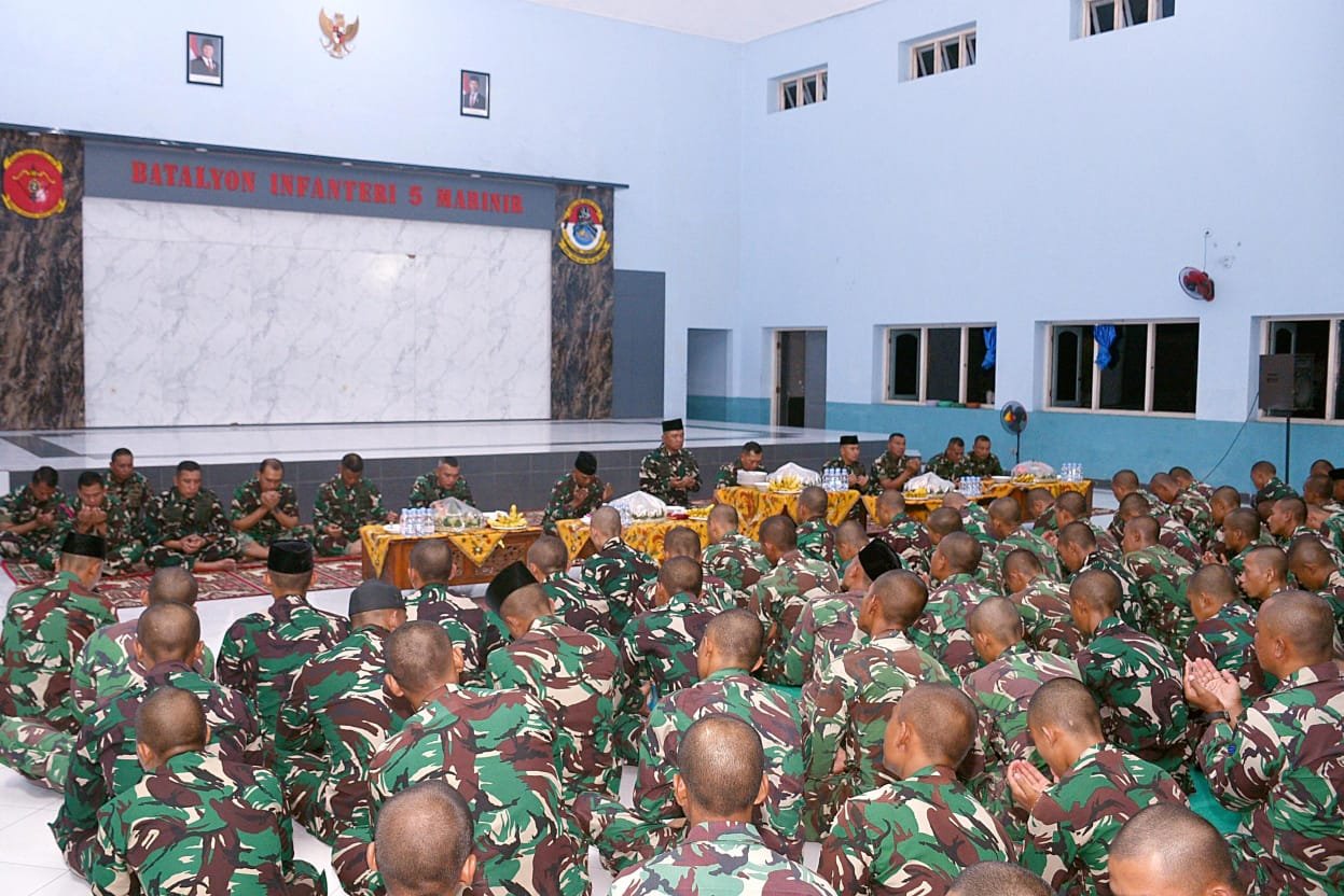 Dispen Kormar TNI AL (Surabaya) Menjelang berangkat untuk melaksanakan latihan di Lembang Bandung, prajurit Pasmar 2 melaksanakan doa bersama dengan Komandan Pasmar 2 Mayjen TNI (Mar) Dr. Oni Junianto di Balai Prajurit Batalyon Infanteri 5 Marinir, Ujung, Semampir, Surabaya. Selasa (14/10/2025)