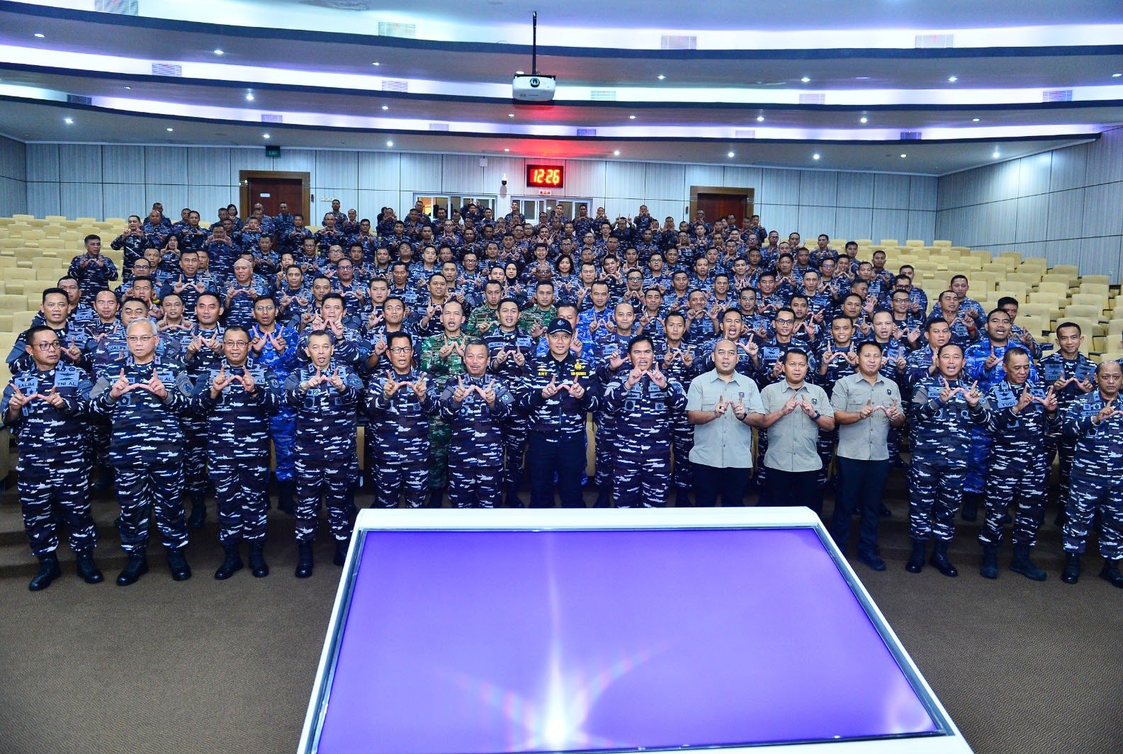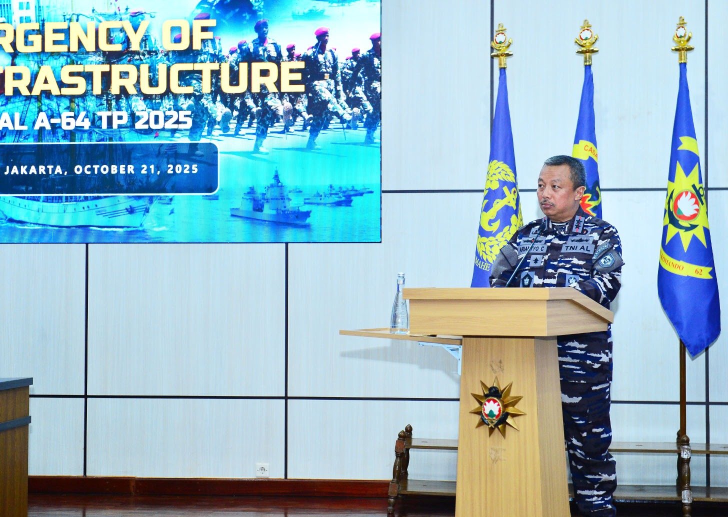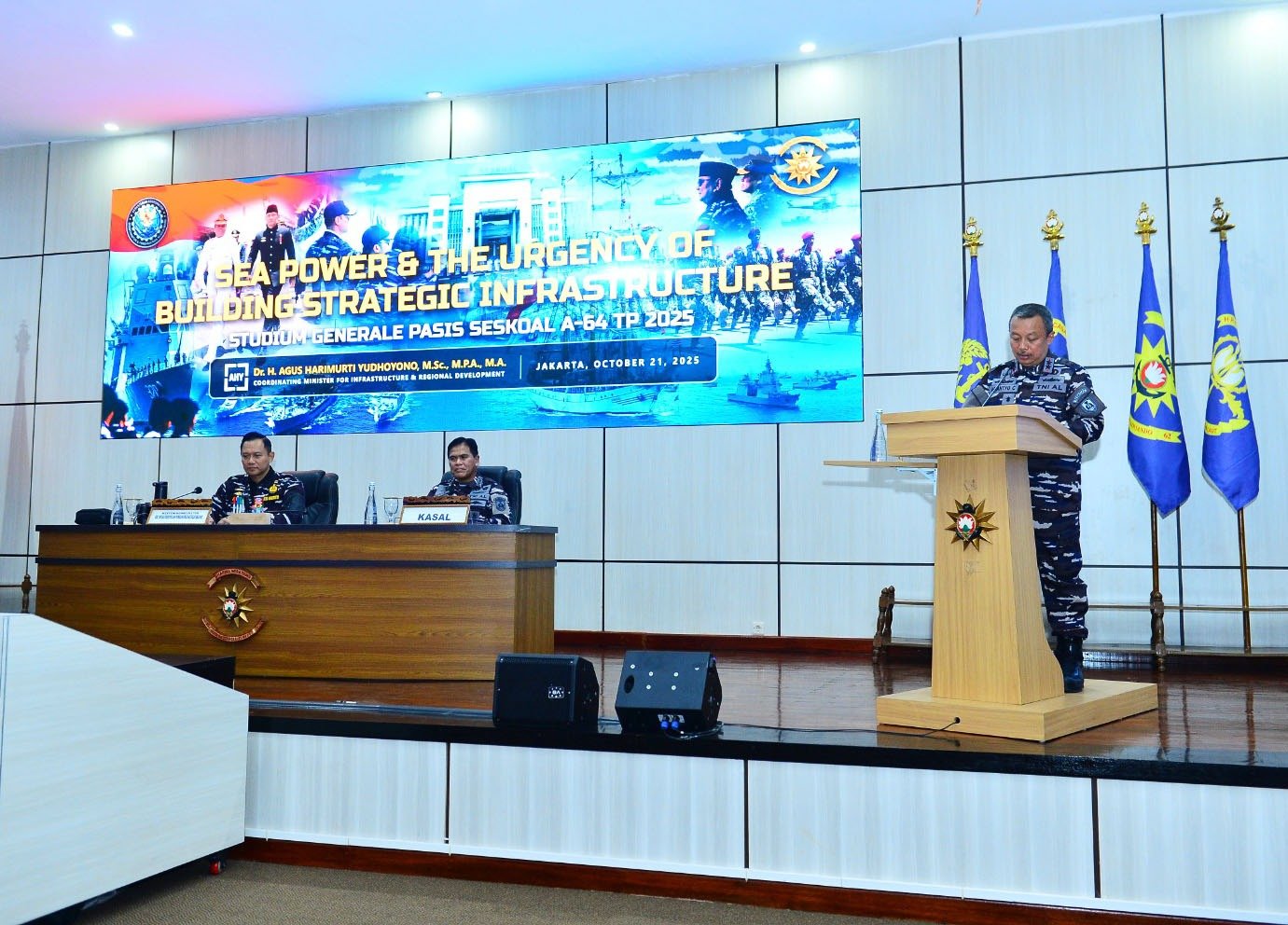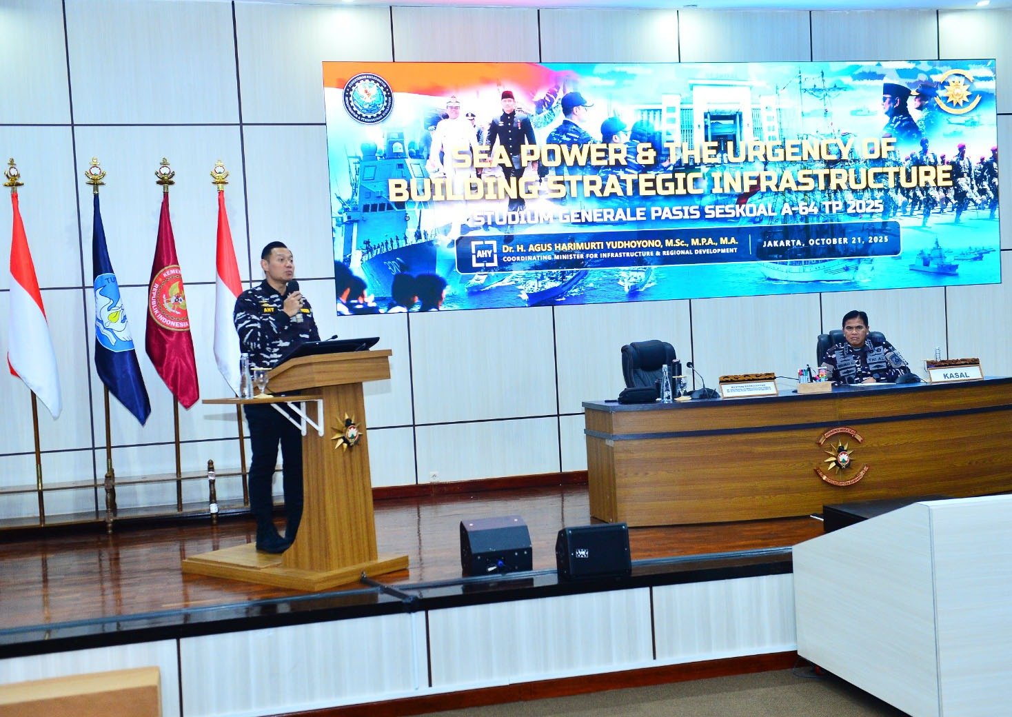 Komandan Sekolah Staf dan Komando Angkatan Laut (Danseskoal) Laksamana Muda TNI Ariantyo Condrowibowo menerima kedatangan Menteri Koordinator (Menko) Bidang Infrastruktur dan Pembangunan Kewilayahan RI Dr. Agus Harimurti Yudhoyono, M.Sc., M.P.A., M.A. dalam rangka memberikan kuliah umum kepada Perwira Siswa Pendidikan Reguler (Pasis Dikreg) Seskoal angkatan ke-64 TA 2025 dengan judul “Sea Power and the Urgency of Building Strategic Infrastructure”, dihadiri Kepala Staf Angkatan Laut (Kasal) Laksamana TNI Dr. Muhammad Ali, S.E., M.M., M.Tr.Opsla, bertempat di amphitheater gedung Samadikun Seskoal, Cipulir, Jakarta Selatan, Selasa (21/10/2025).