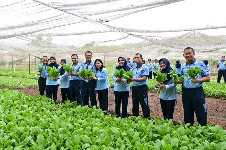 Lanud Roesmin Nurjadin terus menunjukkan komitmennya dalam mendukung program pemerintah di bidang ketahanan pangan melalui panen sayur di area Kebun Mustang, Jumat (17/10/2025).