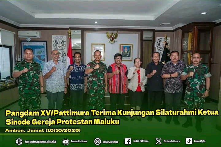 Pangdam XV/Pattimura Mayjen TNI Putranto Gatot Sri Handoyo, S.Sos., M.M. menerima kunjungan silaturahmi Ketua Sinode Gereja Protestan Maluku, Pdt. Elifas Tomix Maspaitella beserta staf di ruang kerjanya, Jumat (10/10/2025).