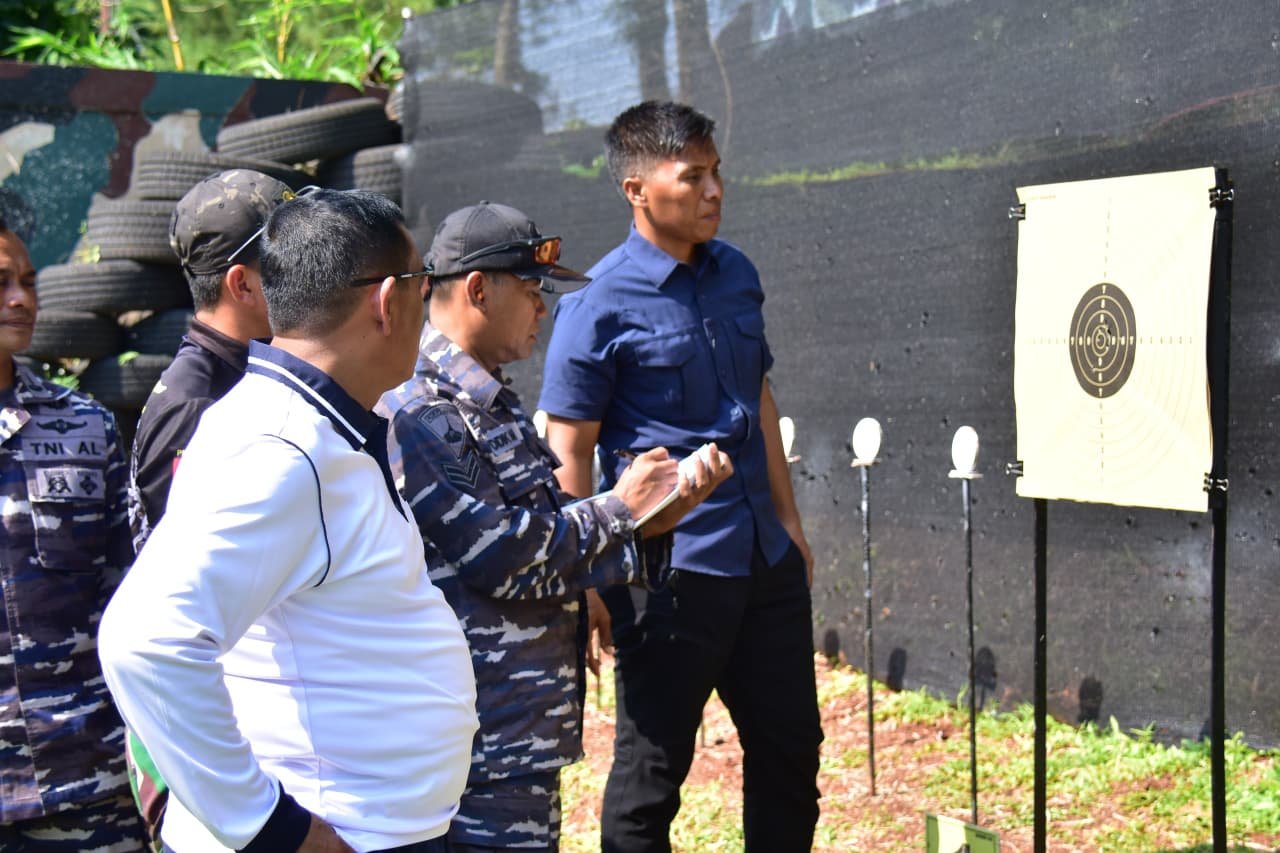 Dispen Kormar (Jakarta).Panglima Korps Marinir (Pangkormar) Letjen TNI Dr. Endi Supardi S.E., M.M., M.Tr.Opsla., CHRMP., CRMP., beserta Pejabat Utama Mako Kormar melaksanakan latihan menembak pistol di Lapangan Tembak Pistol Jusman Puger Kesatrian Marinir Hartono, Cilandak, Jakarta Selatan, Jum’at (10/10/2025).