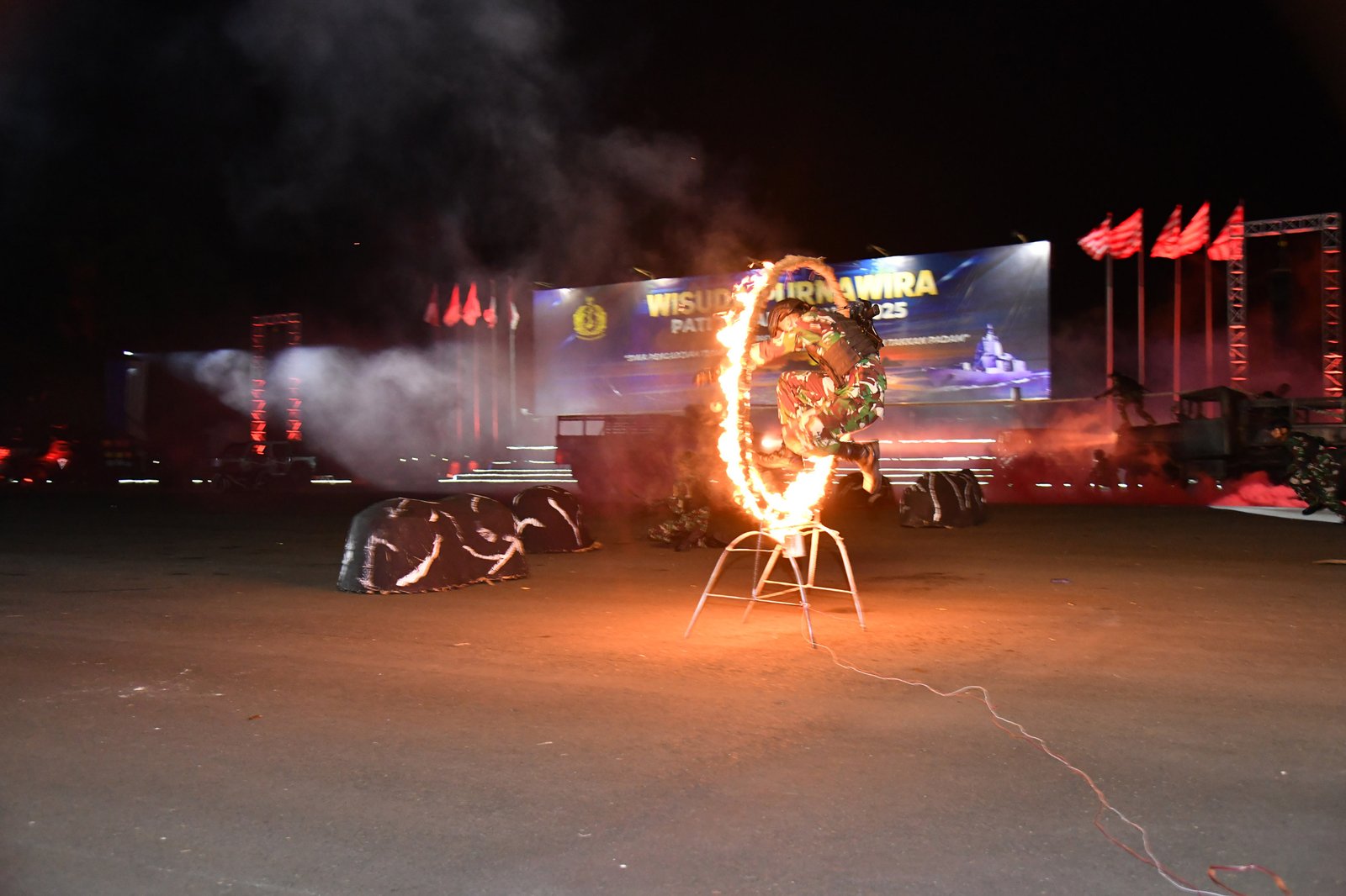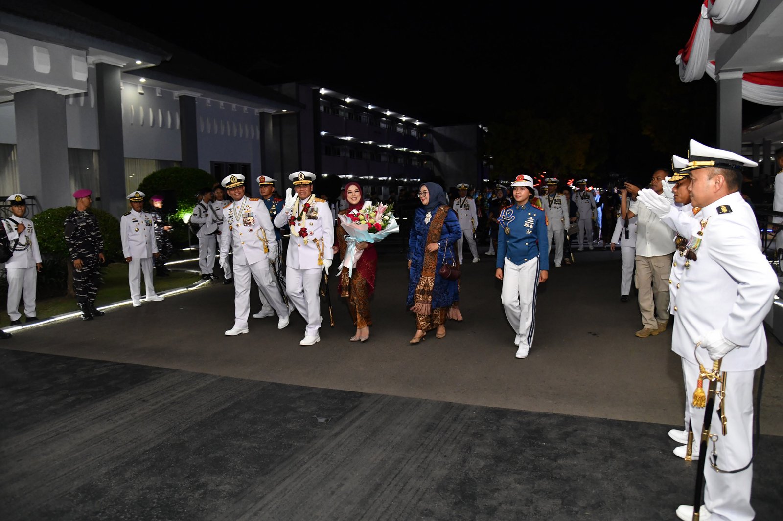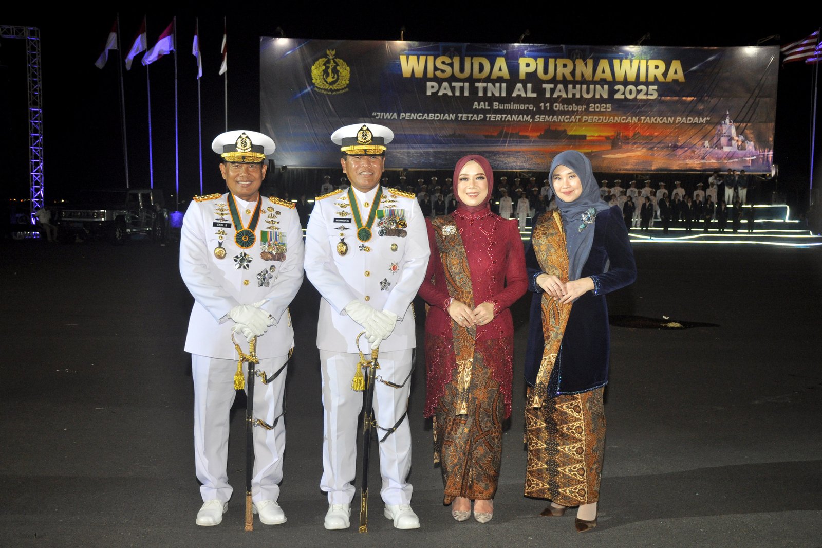 Dispen Kormar (Surabaya) – Panglima Korps Marinir (Pangkorps Marinir) Letnan Jenderal TNI (Mar) Dr. Endi Supardi, S.E., M.M., M.Tr.Opsla., CHRMP., CRMP. Didampingi  Ketua Gabungan Jalasenastri Korps Marinir Ny. Nana Endi Supardi menghadiri Upacara Wisuda Purna Wira (WPW) Perwira Tinggi (Pati) TNI AL Tahun 2025, yang digelar di Lapangan Laut Arafuru, Akademi Angkatan Laut (AAL) Bumi Moro, Surabaya, pada Sabtu malam (11/10/2025).