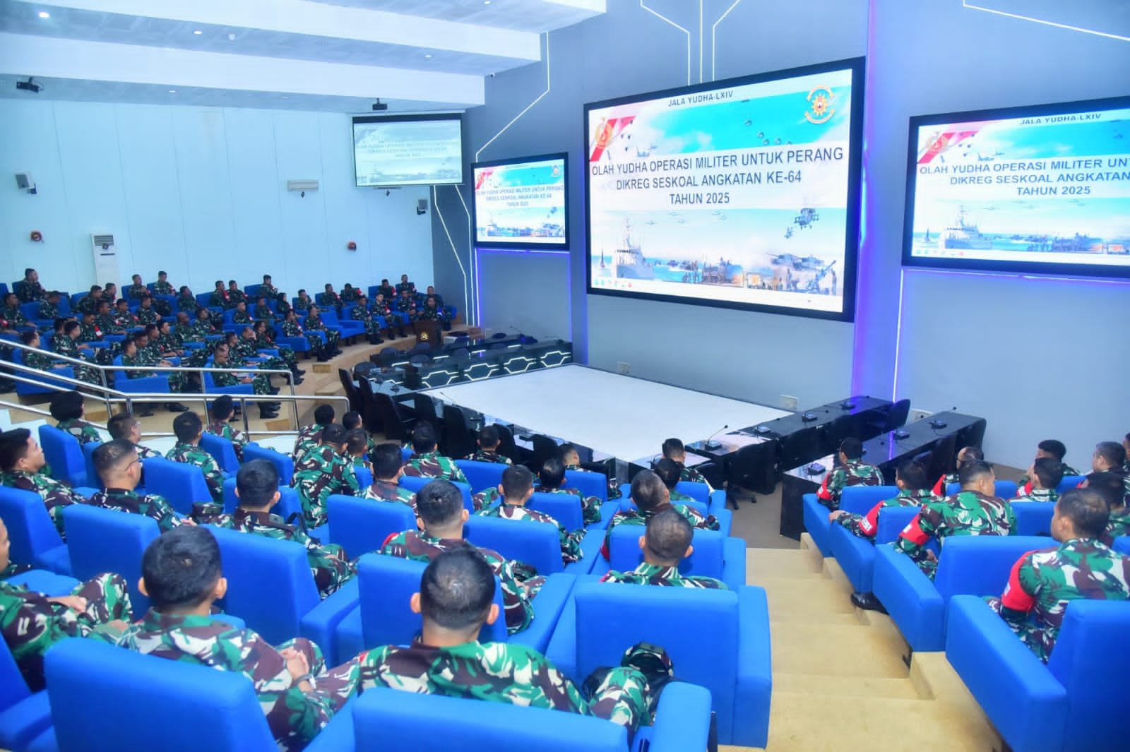 Komandan Sekolah Staf dan Komando Angkatan Laut (Danseskoal) Laksamana Muda TNI Ariantyo Condrowibowo selaku Pimpinan Umum Latihan (Pimumlat) diwakili Direktur Pendidikan (Dirdik) Seskoal Kolonel Laut (P) Baharudin Anwar, S.T., M.M., selaku Direktur Latihan (Dirlat) memberikan briefing awal latihan Olah Yudha Operasi Militer Perang (Oyu OMP) “Jala Yudha LXIV” Perwira Siswa (Pasis) Pendidikan Reguler (Dikreg) Seskoal angkatan ke-64 TA 2025, bertempat di Amphitheater Pusoyu Seskoal, Cipulir, Jakarta Selatan, Senin (17/11/2025).