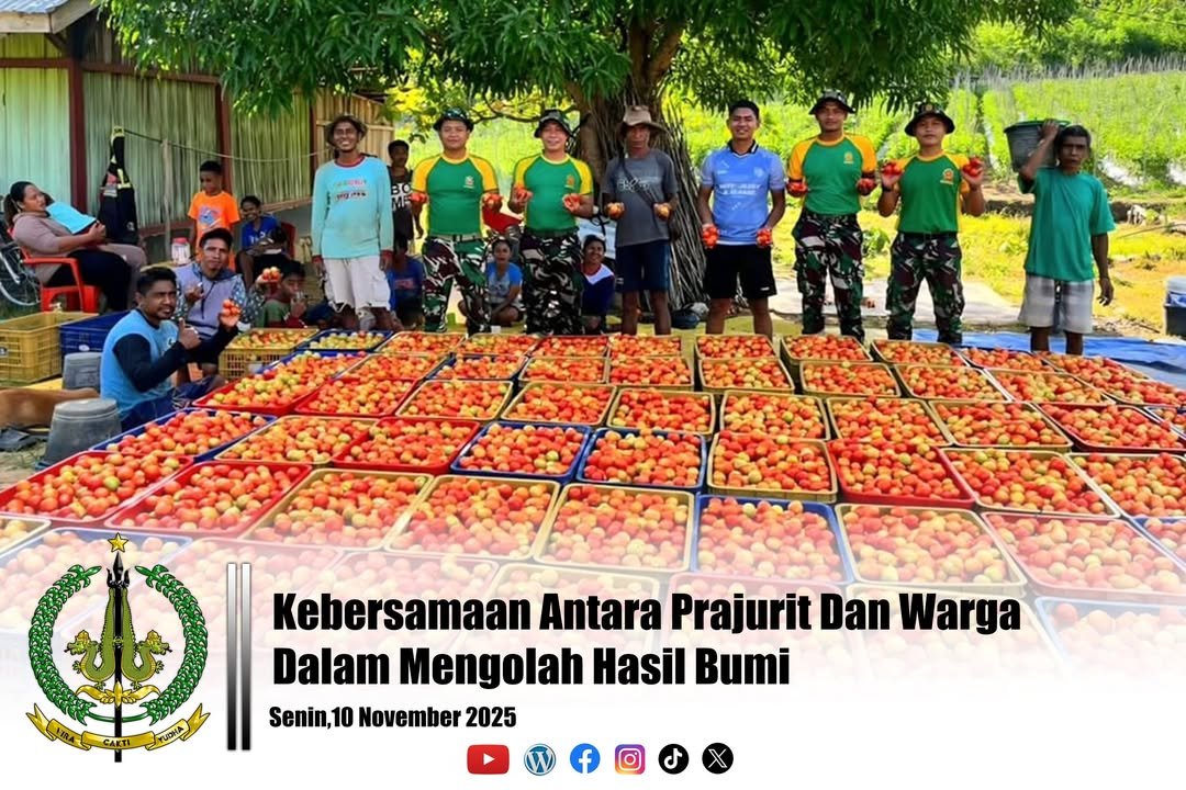 Belu — Pos Lookeu Satgas Pamtas RI–RDTL Sektor Timur Yonarmed 12 Kostrad melaksanakan kegiatan panen tomat bersama masyarakat di wilayah perbatasan Desa Lookeu, Kecamatan Tasifeto Barat, Kabupaten Belu, NTT. Kegiatan ini menjadi momen kebersamaan antara prajurit TNI dan warga dalam mengolah hasil bumi di perbatasan. Senin (10/11/2025).