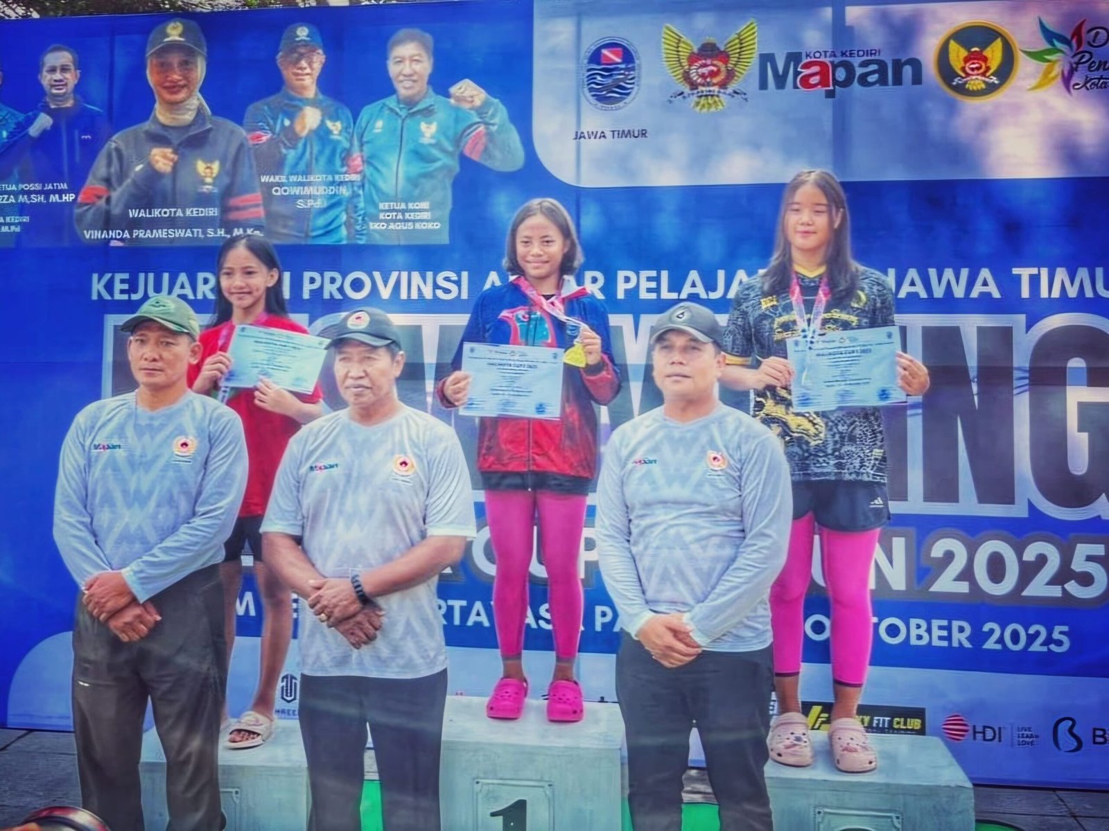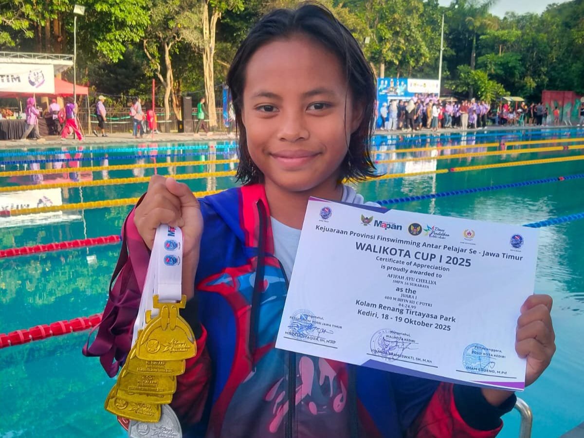 TNI AL, Dispen Kormar (Kediri). Membanggakan, Putra Putri prajurit Detasemen Intai Para Amfibi 2 Marinir berhasil membawa pulang 8 Medali Kejurprov Finswiming Antar Pelajar Se Jawa Timur Tahun 2025 di Kolam Renang Tirtayasa Park Kota Kediri. Minggu (19/10/2025).