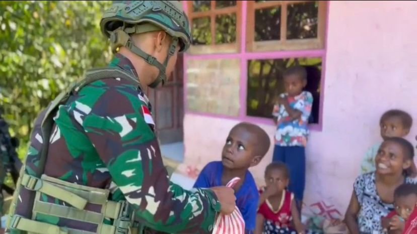 Maybrat, Papua Barat Daya — Bentuk aplikasi kegiatan teritorial dengan masyarakat sekitar, Satgas Pamtas RI-PNG Kewilayahan Yonif 763/SBA Pos Afkrem melaksanakan pembagian logistik berupa sembako yang berisikan beras, telur, mie sedap, dan lain-lainnya kepada masyarakat Kampung Afkrem. (19/10/2025).
