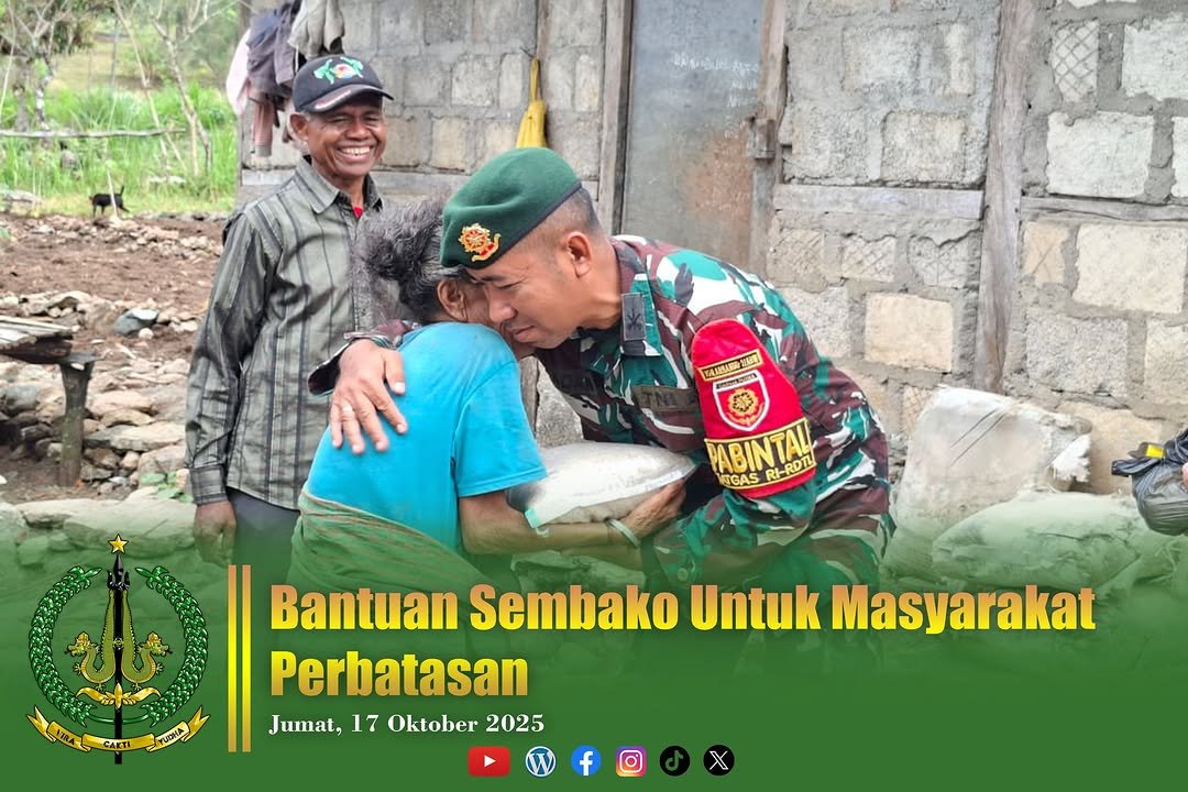Eban – Prajurit Makosatgas Pamtas RI-RDTL Sektor Barat Yonarhanud 2 Kostrad adakan kegiatan Jumat Berkah berikan bantuan Sembako bagi masyarakat perbatasan yang membutuhkan di Desa Eban, Kec. Miomaffo Barat, Kab. TTU. Jumat (17/10).
