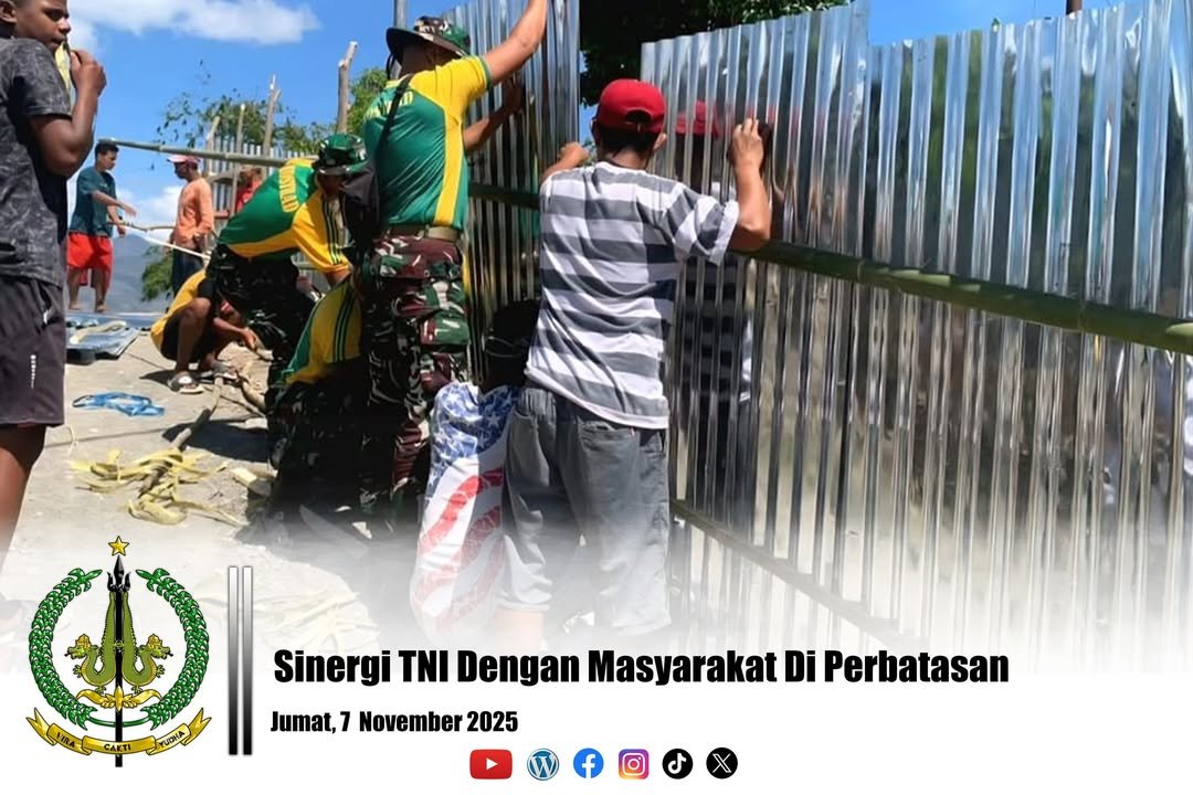 Belu, Nusa Tenggara Timur — Prajurit Pos Lakmars Satgas Pengamanan Perbatasan RI–RDTL Yonarmed 12 Kostrad bersama masyarakat Desa Lakmaras melaksanakan kegiatan Karya Bakti dalam rangka persiapan acara adat sambut baru (Komuni) yang menjadi tradisi penting bagi warga setempat, Jumat (07/11/2025).