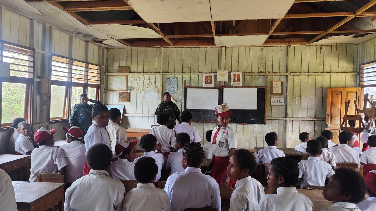 Tarub, Pegunungan Bintang — Bertempat di SD Inpres Tarub, anggota Satgas Pamtas RI–PNG Yonif 751/Vira Jaya Sakti (VJS) melaksanakan kegiatan Pembinaan Teritorial (Binter) berupa Wawasan Kebangsaan kepada para murid. Kegiatan dipimpin langsung Danpos Tarub, Letda Inf Elpidius Rayson, bersama personel Pos Tarub yang hadir sebagai narasumber dan pendamping.(Jumat,14/11/2025).