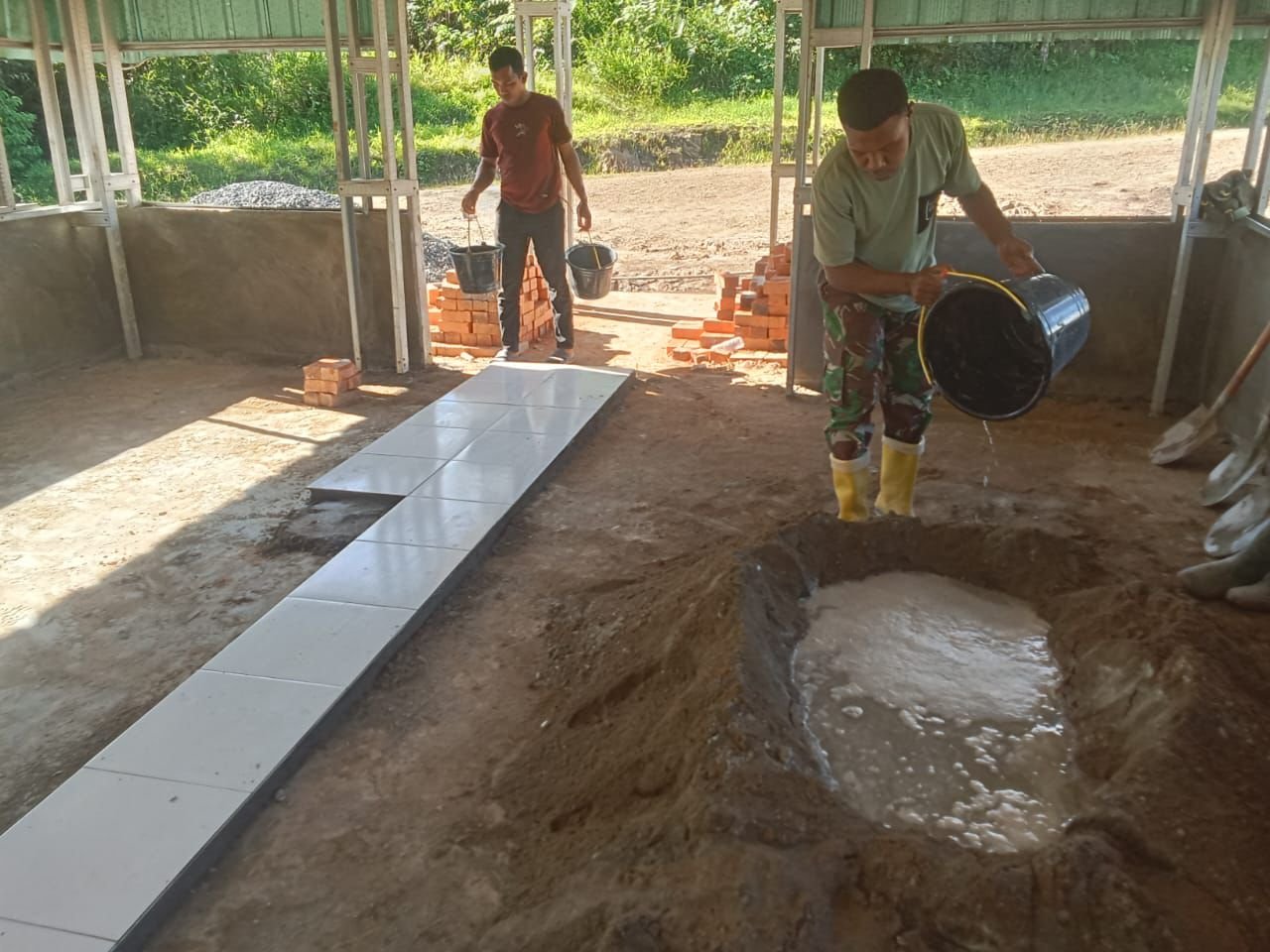Satgas TMMD 126 Kodim Tambrauw Lanjutkan Pemasangan Keramik pada Pembangunan Gereja Advent