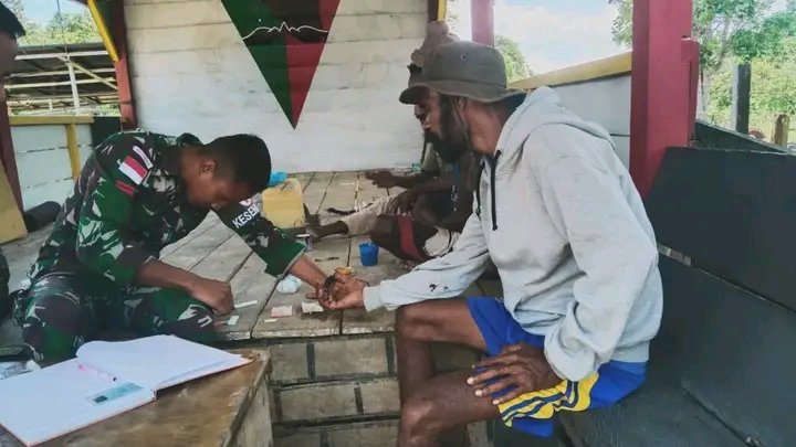 Sebagai wujud kepedulian terhadap kesehatan masyarakat di wilayah perbatasan, Satgas Pamtas RI-PNG Yonif 121/Macan Kumbang Pos KM 140 memberikan pelayanan pengobatan kepada warga Kampung Monggoafi, Desa Yabanda, Distrik Yaffi, Kabupaten Keerom, Papua, yang datang langsung ke Pos ,Kamis (16/10/2025).
